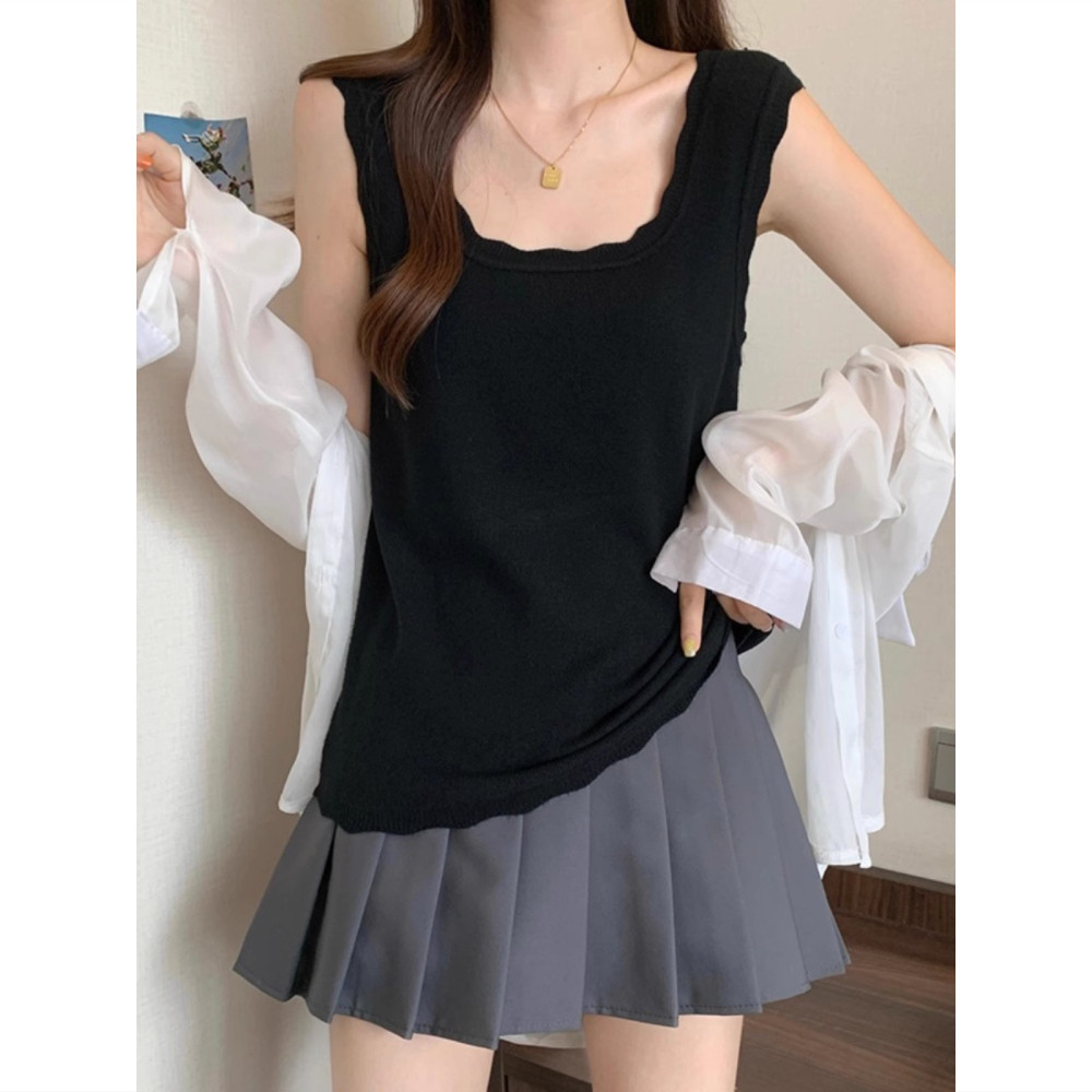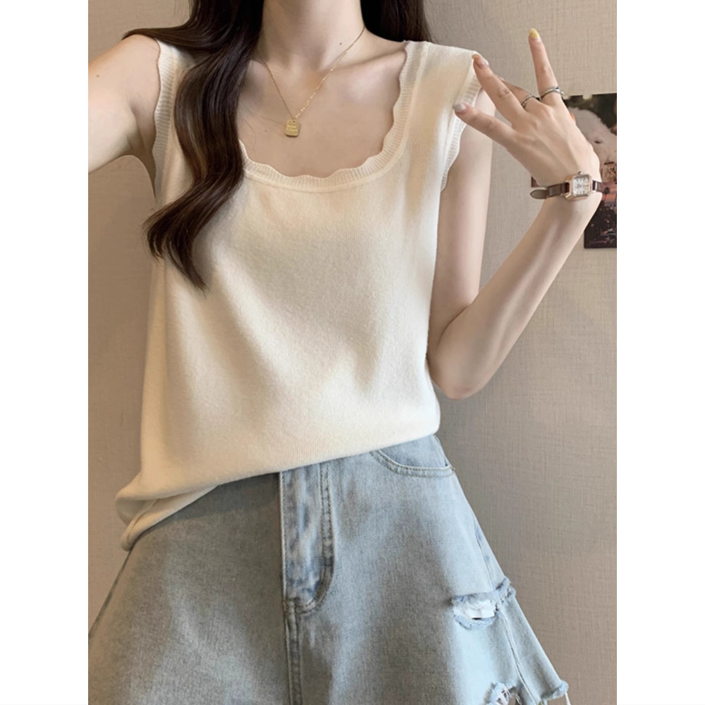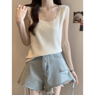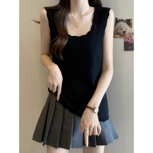上衣 设计感打底内搭无袖 法式 花边方领冰丝针织吊带背心女外穿夏季