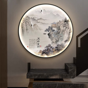 山水意境圆形装 饰画走廊过道玄关挂画茶室氛围灯画餐厅背景墙壁画
