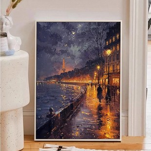 巴黎雨夜装 饰画黑夜意境油画风小众高级北欧油画风成品喷印挂摆画