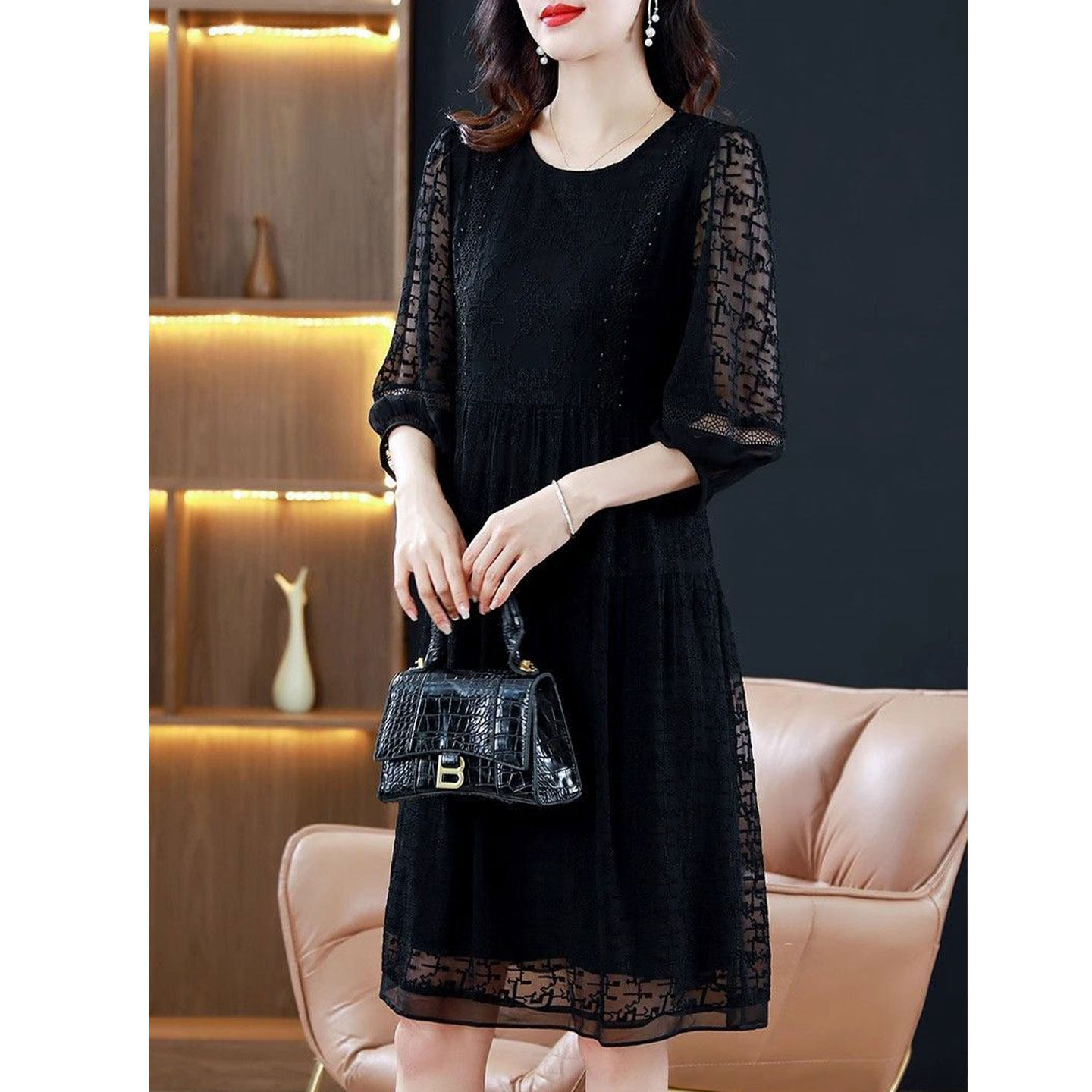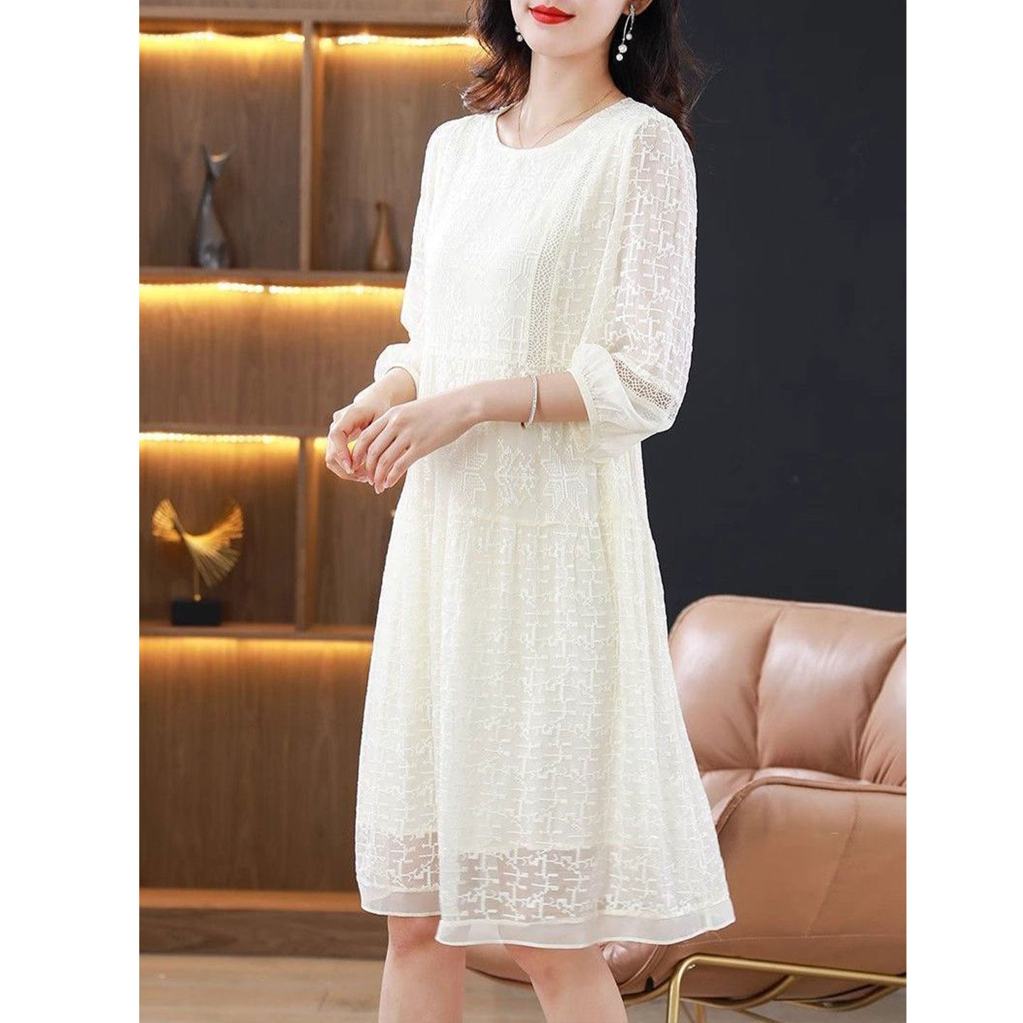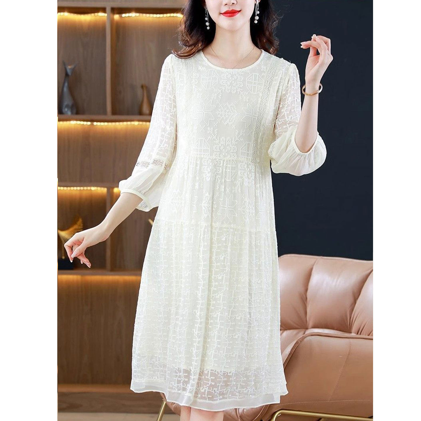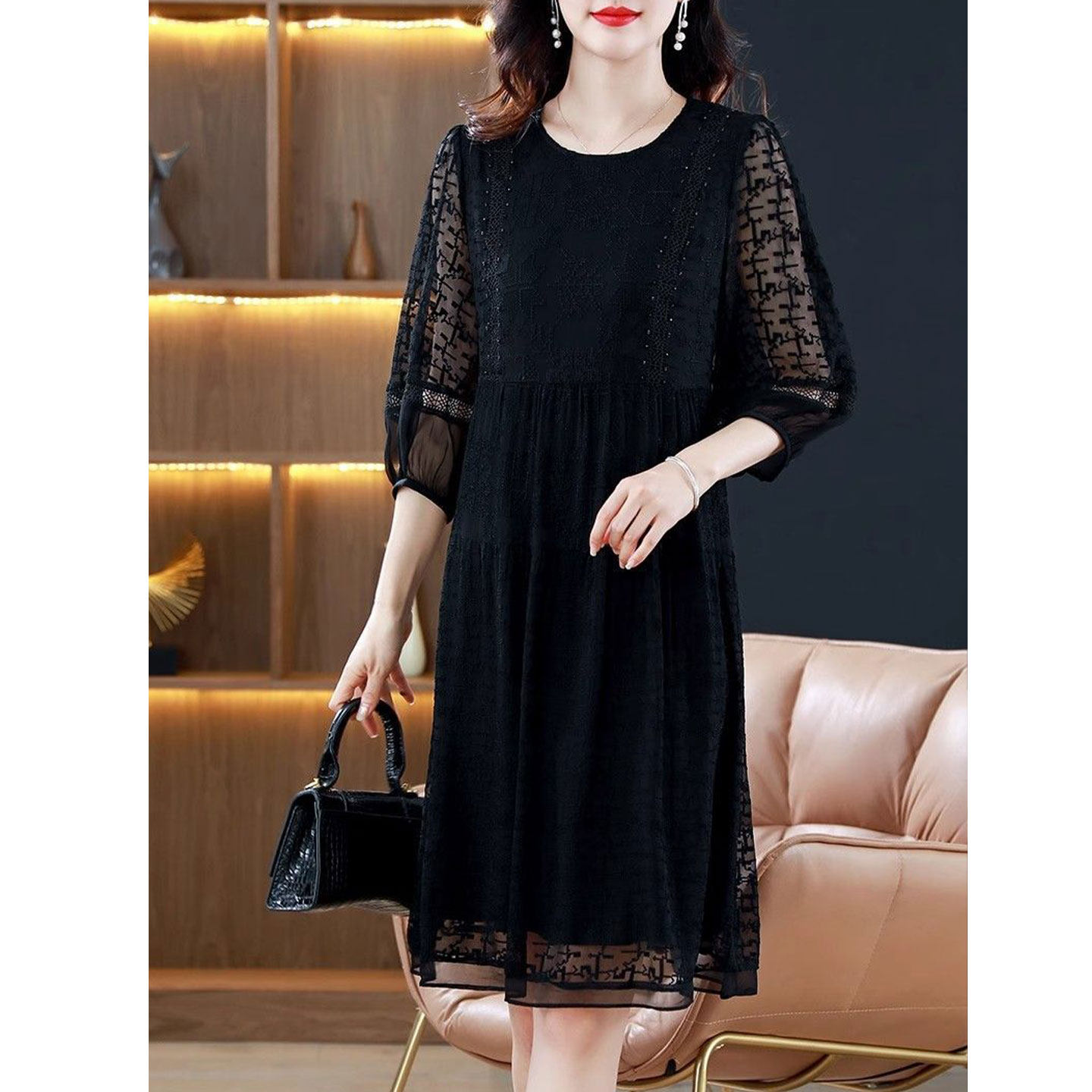 大码 韩版 新款 圆领连衣裙女2025夏季 显瘦气质减龄中长裙 洋气妈妈装