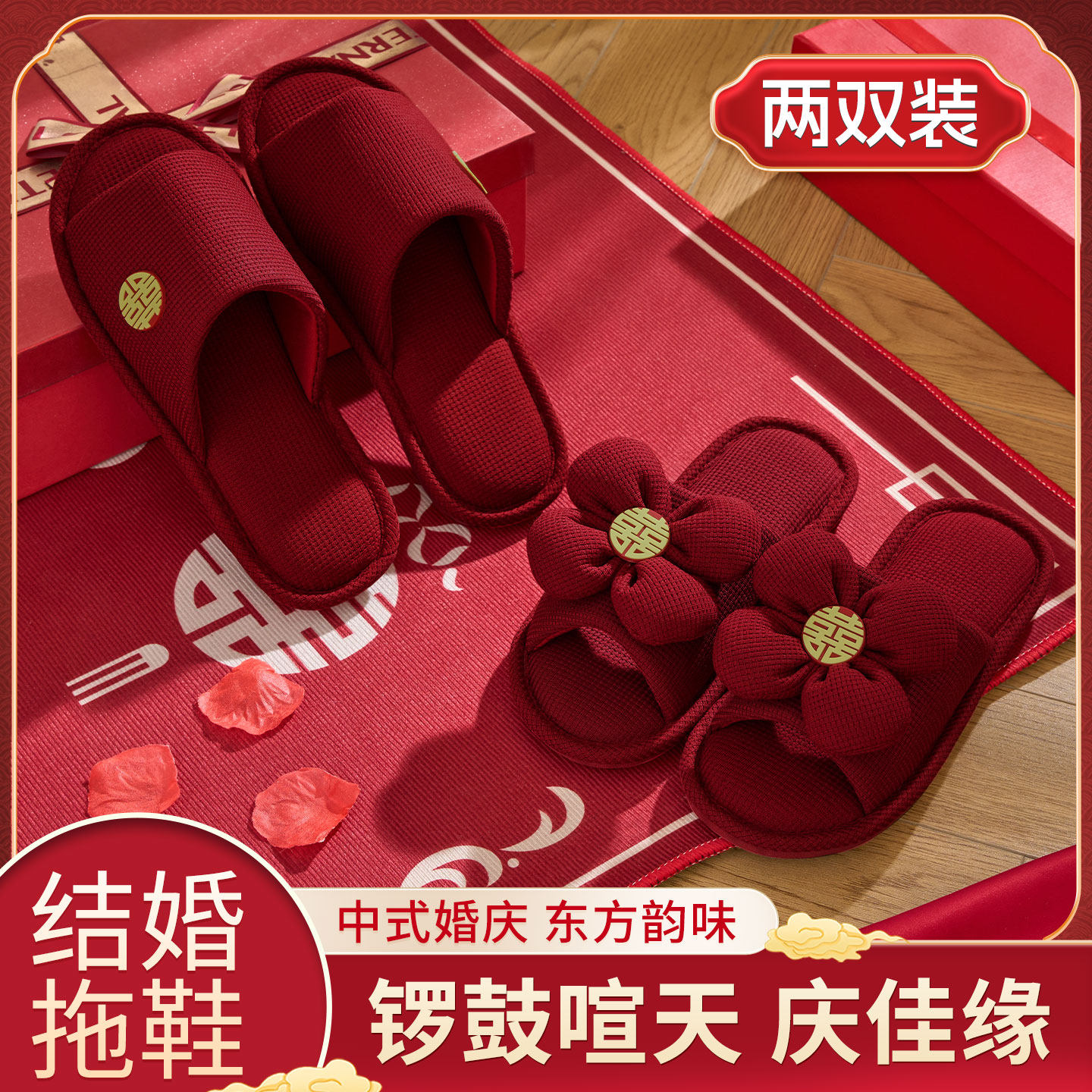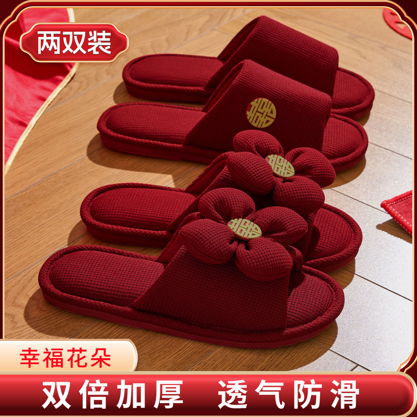 利达妮红色拖鞋 结婚一对喜庆情侣婚庆婚礼新娘陪嫁高级感喜事婚鞋