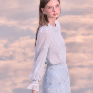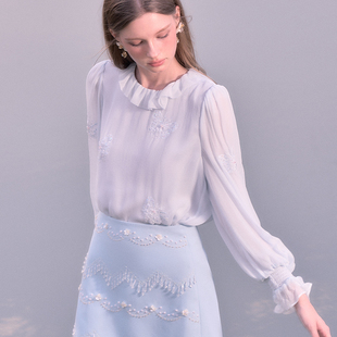 桑蚕丝 绣花亮片衬衫 Marie Elie秋冬烟镜滢杪上衣翻领荷叶长袖