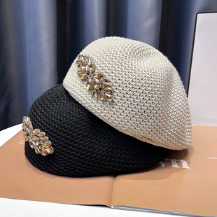 春夏复古水钻花朵贝雷帽女气质显脸小赫本风鸭舌帽韩版 反戴前进帽