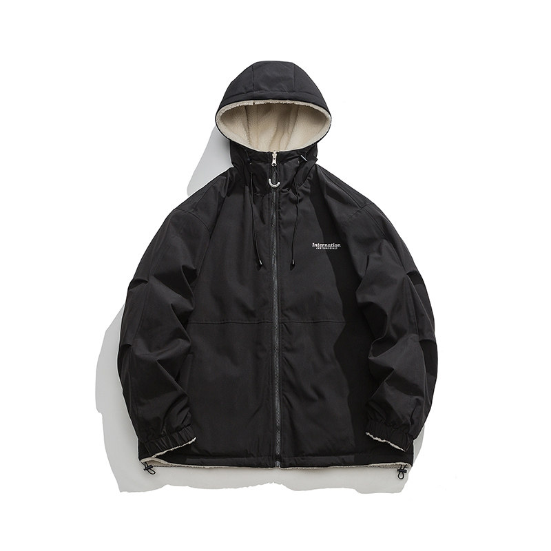 黑色休闲百搭连帽夹克上衣 胖mm双面穿毛绒棉服外套女冬季 大码 女装