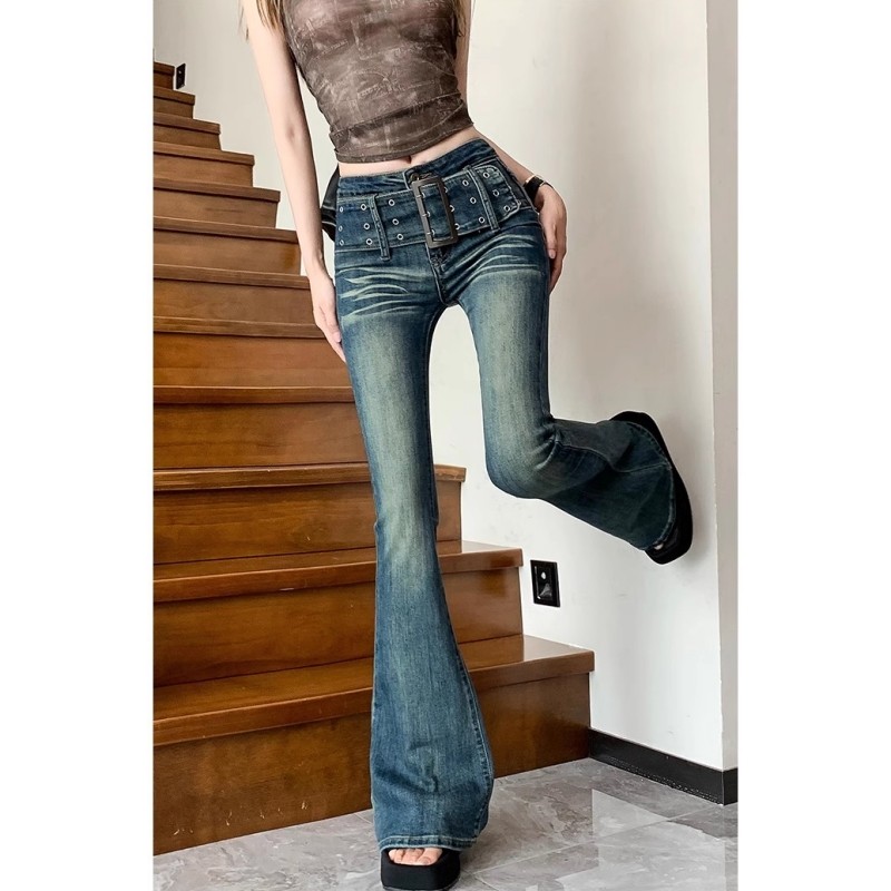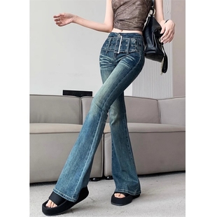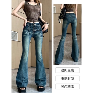 紧身阔腿显瘦百搭长裤 御姐范复古腰带微喇叭牛仔裤 女春秋弹力修身