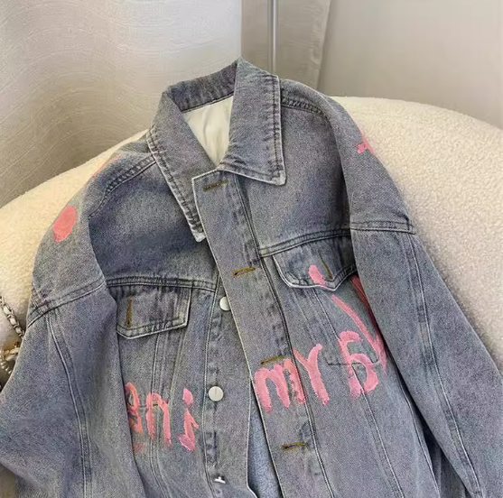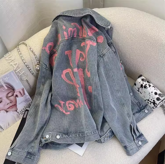 欧洲站春秋字母印花涂鸦牛仔外套女设计感小众宽松长袖 夹克上衣潮