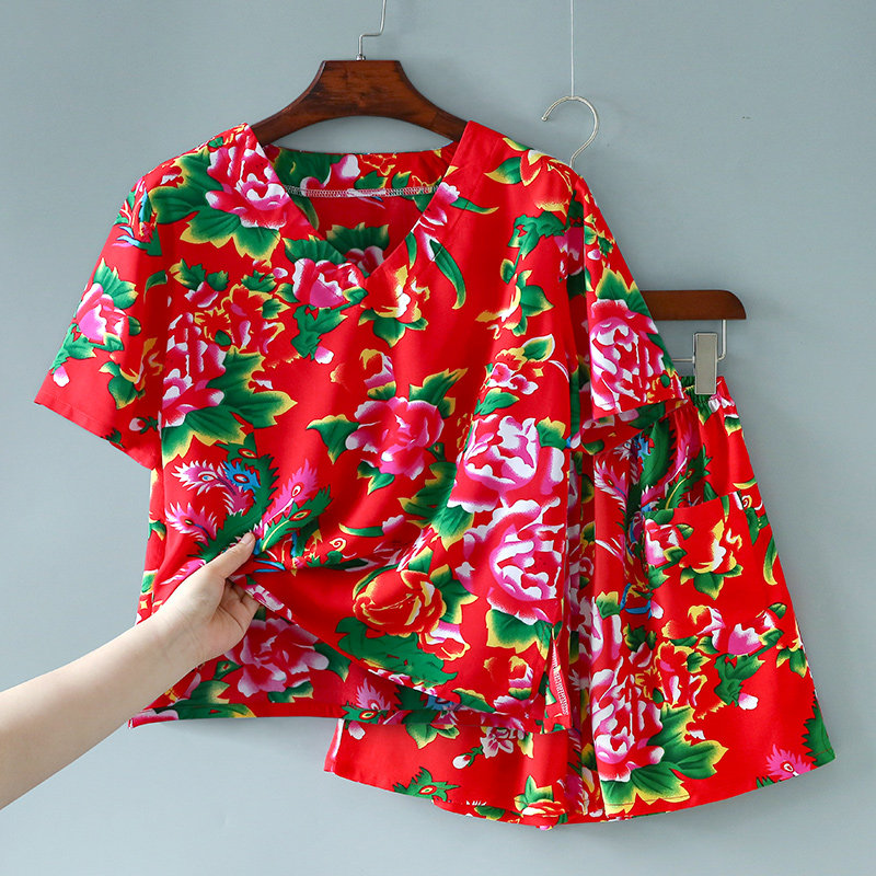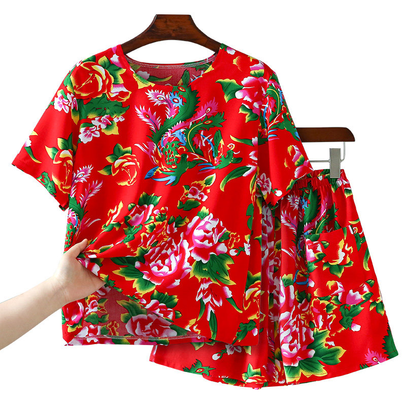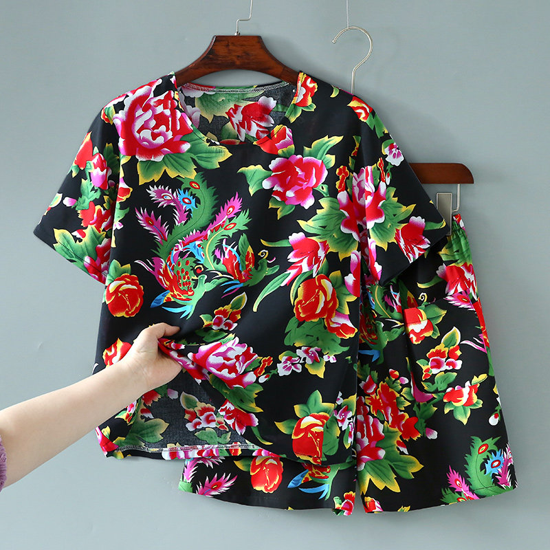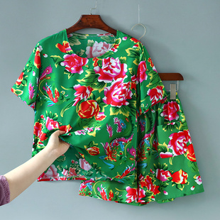 套装 大裤 男女夏棉绸潮流T恤 短裤 衩 聚会休闲薄款 东北大花布短袖