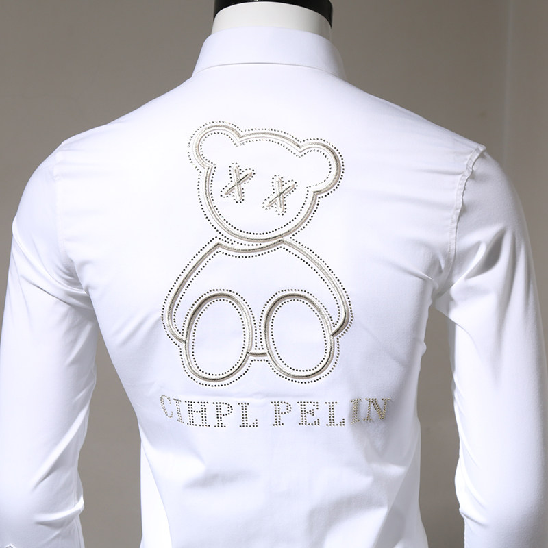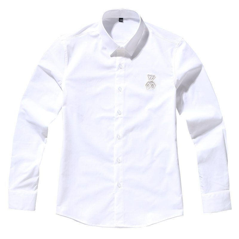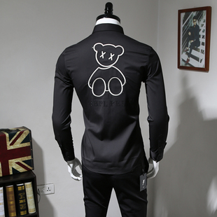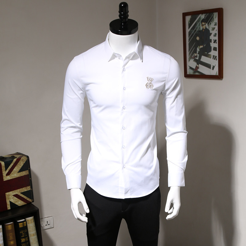 韩版 2025秋季 男修身 衬衫 休闲免烫白衬衣 青年潮流小熊烫钻刺绣长袖