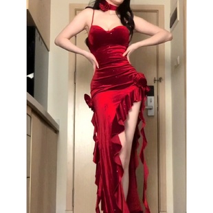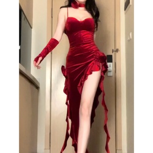 GirlsAt18 圣诞红色连衣裙女高级丝绒吊带裙不规则性感晚礼服长裙