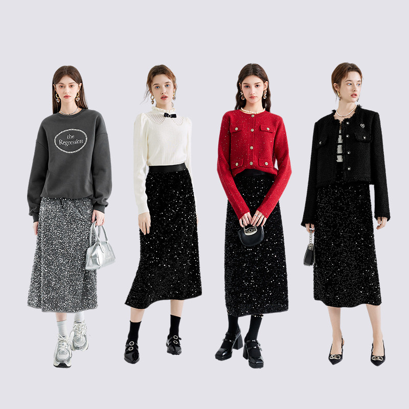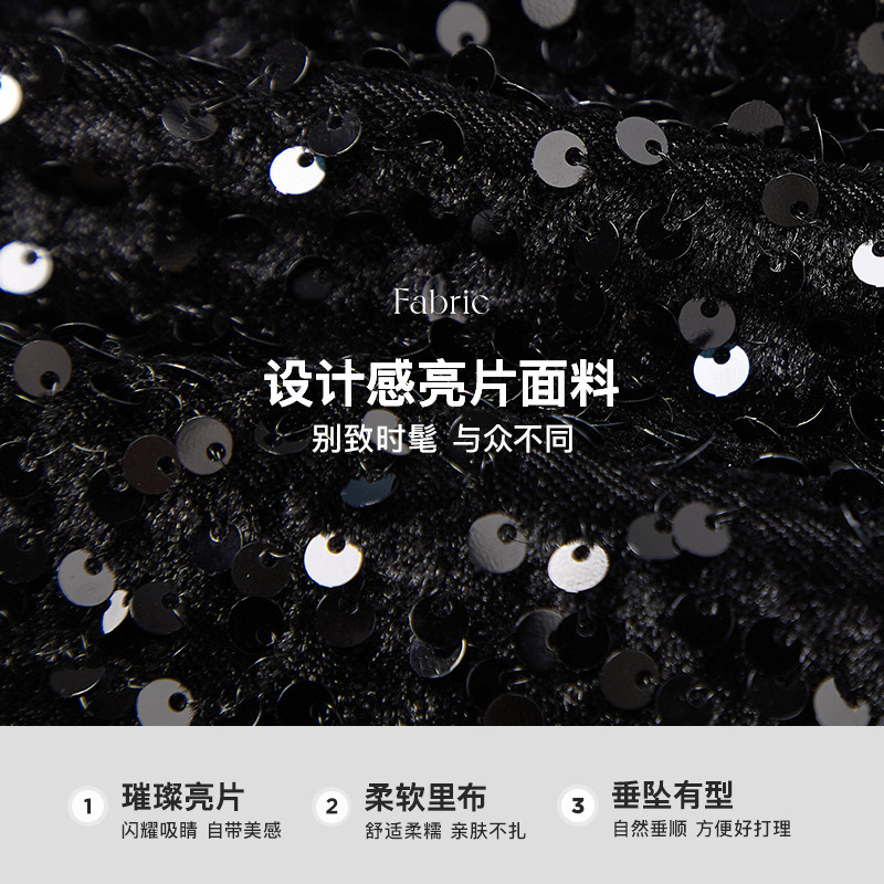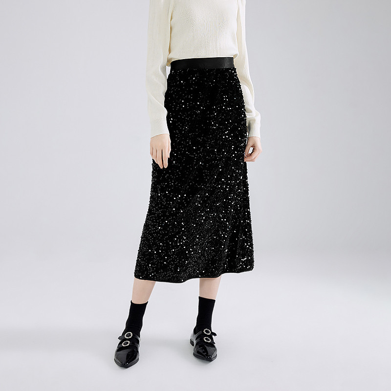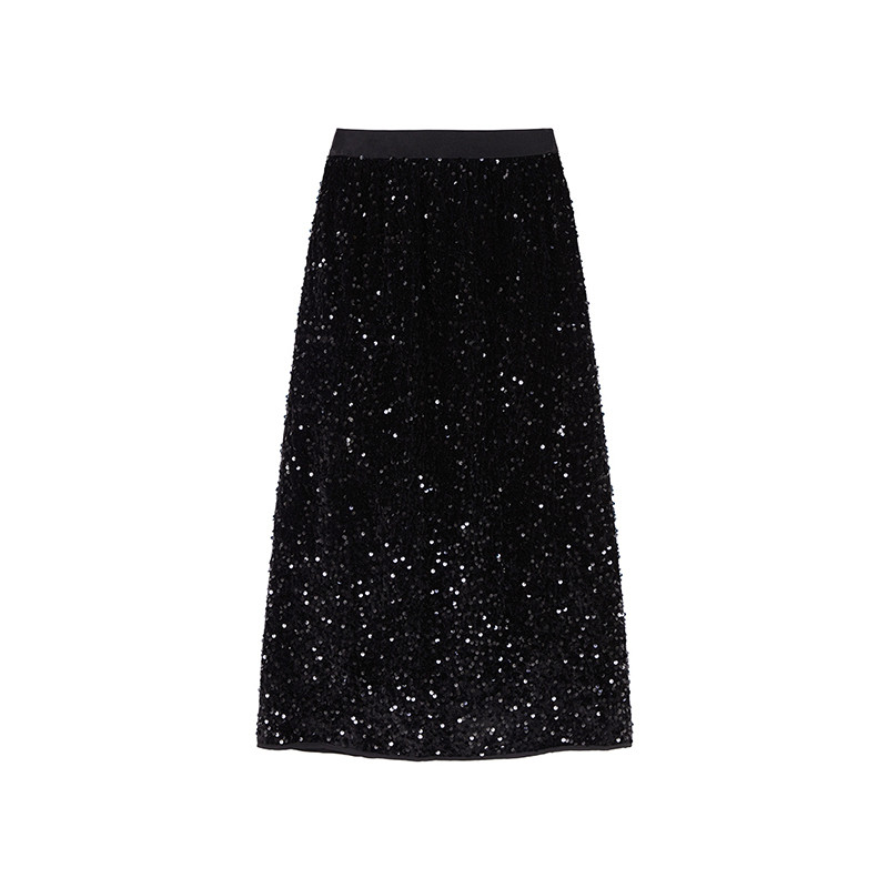 秋水伊人亮片裙黑色半身裙2025秋冬女装 A字年会亮片闪钻裙子