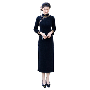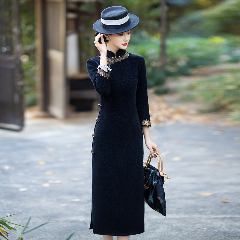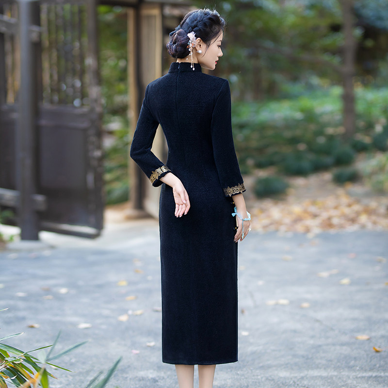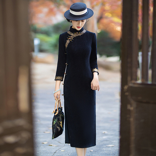 2025新款 秋冬季 高贵军阀阔太太复古民国风 长袖 毛呢旗袍裙女新中式