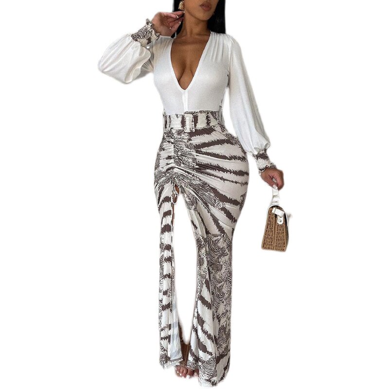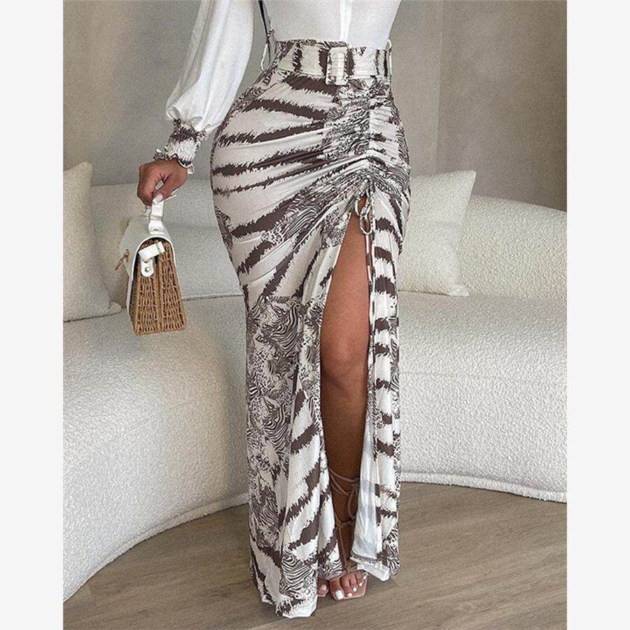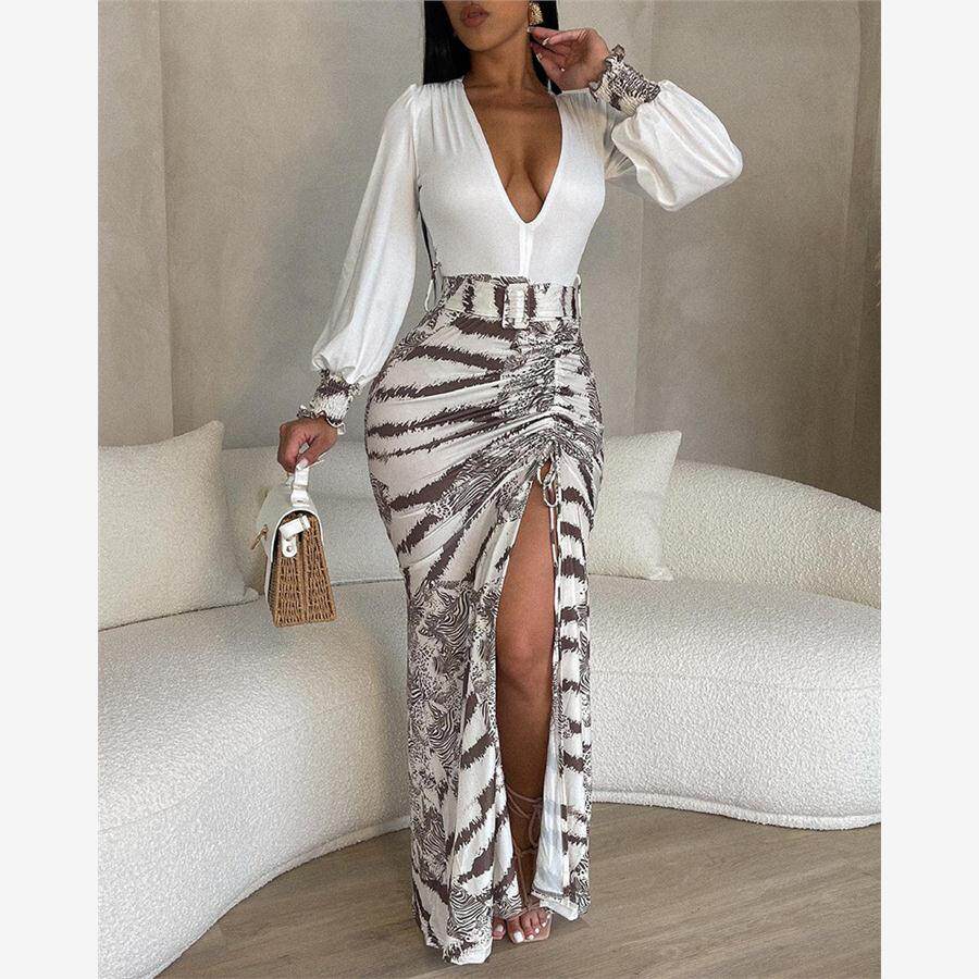 Plunge High Slit Tie Maxi Print Drawstring Dress连衣裙 Dye