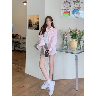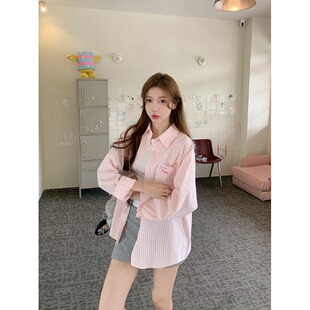 字母刺绣长袖 外套女春秋慵懒风休闲衬衣宽松韩系上衣 粉色条纹衬衫