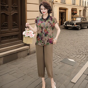 大码 2025夏新款 妈妈装 套装 中老年遮肉显瘦两件套 洋气翻领开衫 时尚