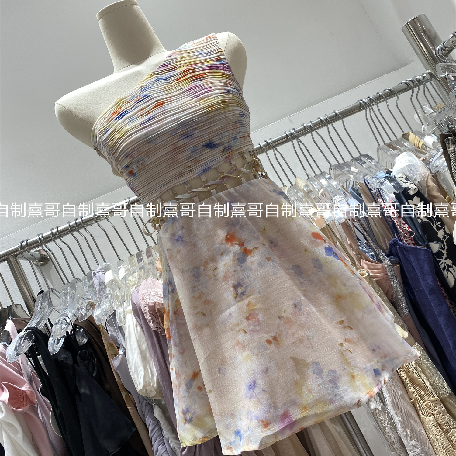 纯欲风辣妹晕染花朵吊带连衣裙女夏季 斜肩显瘦收腰印花公主短裙子