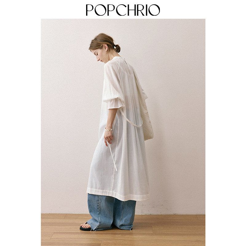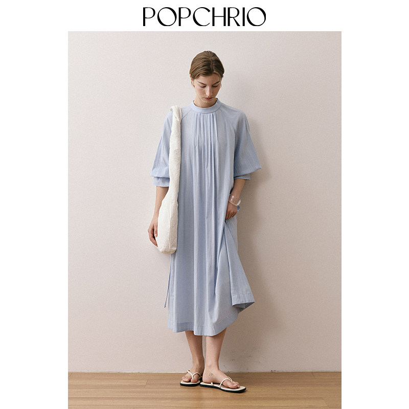 POPCHRIO欧可芮 休闲连衣裙宽松叠穿长裙子女 微透立领泡泡半中袖