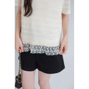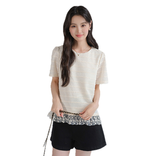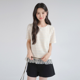 T恤胖mm夏装 韩系蕾丝拼接短袖 设计感减龄宽松上衣 女装 蓝若水大码