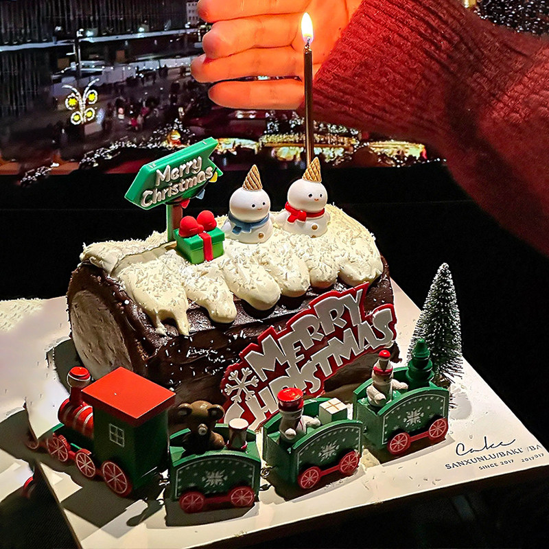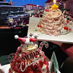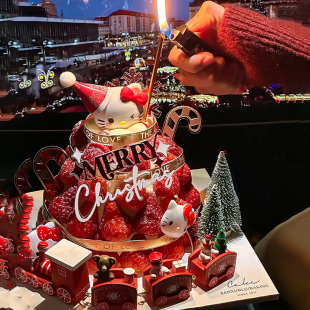 2025网红kt凯蒂猫甜品圣诞塔主题蛋糕装 饰英文插件摆件火车圣诞树
