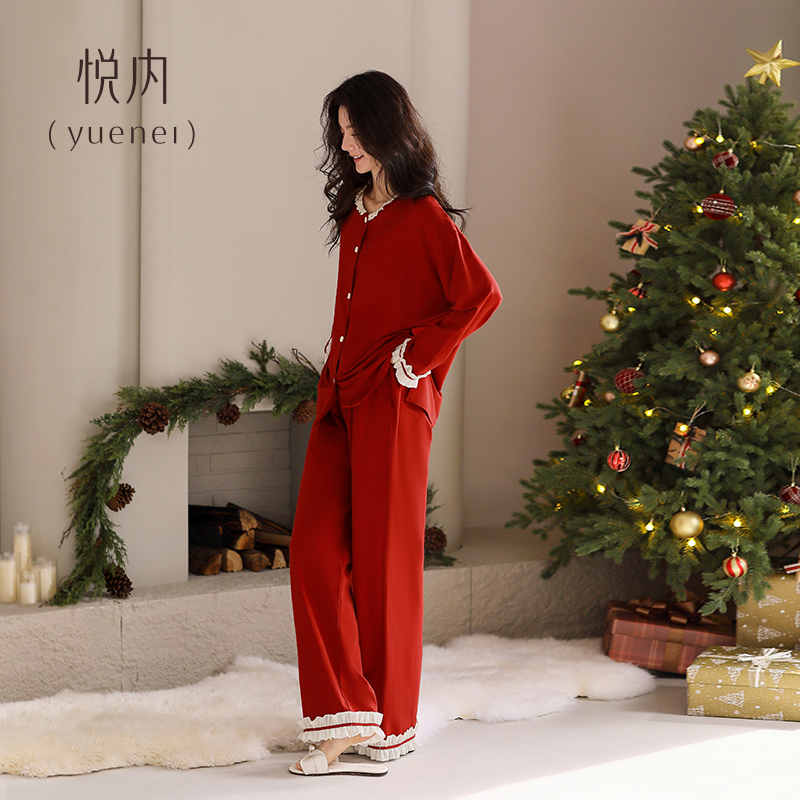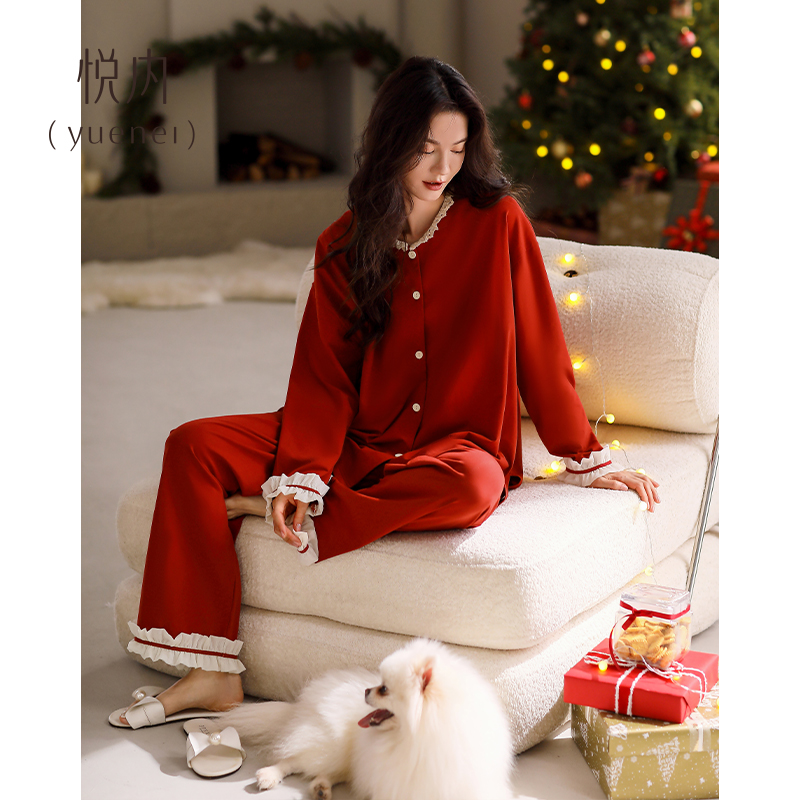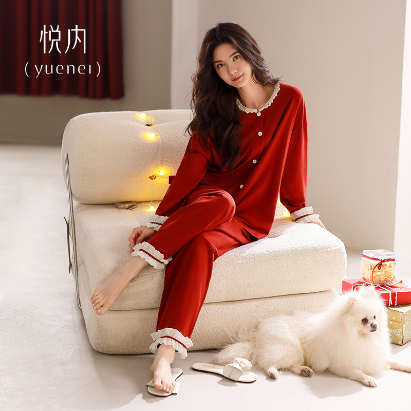 纯棉家居服大红色本命年蛇年新年小香风 长袖 悦内睡衣女春秋季 秋款