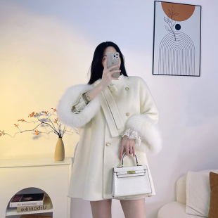 2025秋冬蝴蝶结狐狸毛粉色双面羊绒大衣秋冬新款 羊毛斗篷外套女