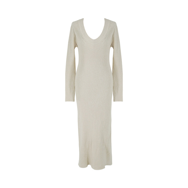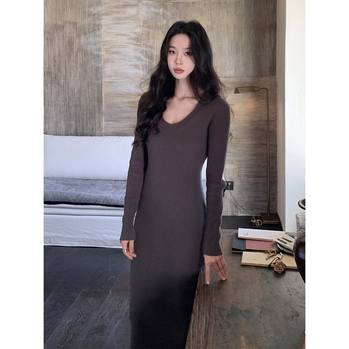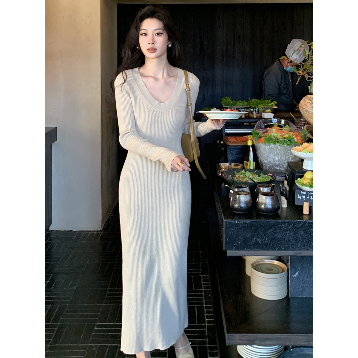新款 显瘦针织连衣裙打底裙女冬季 收腰A字长裙 U型领修身 SYT自制