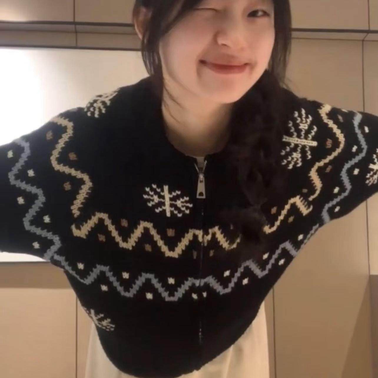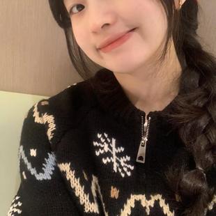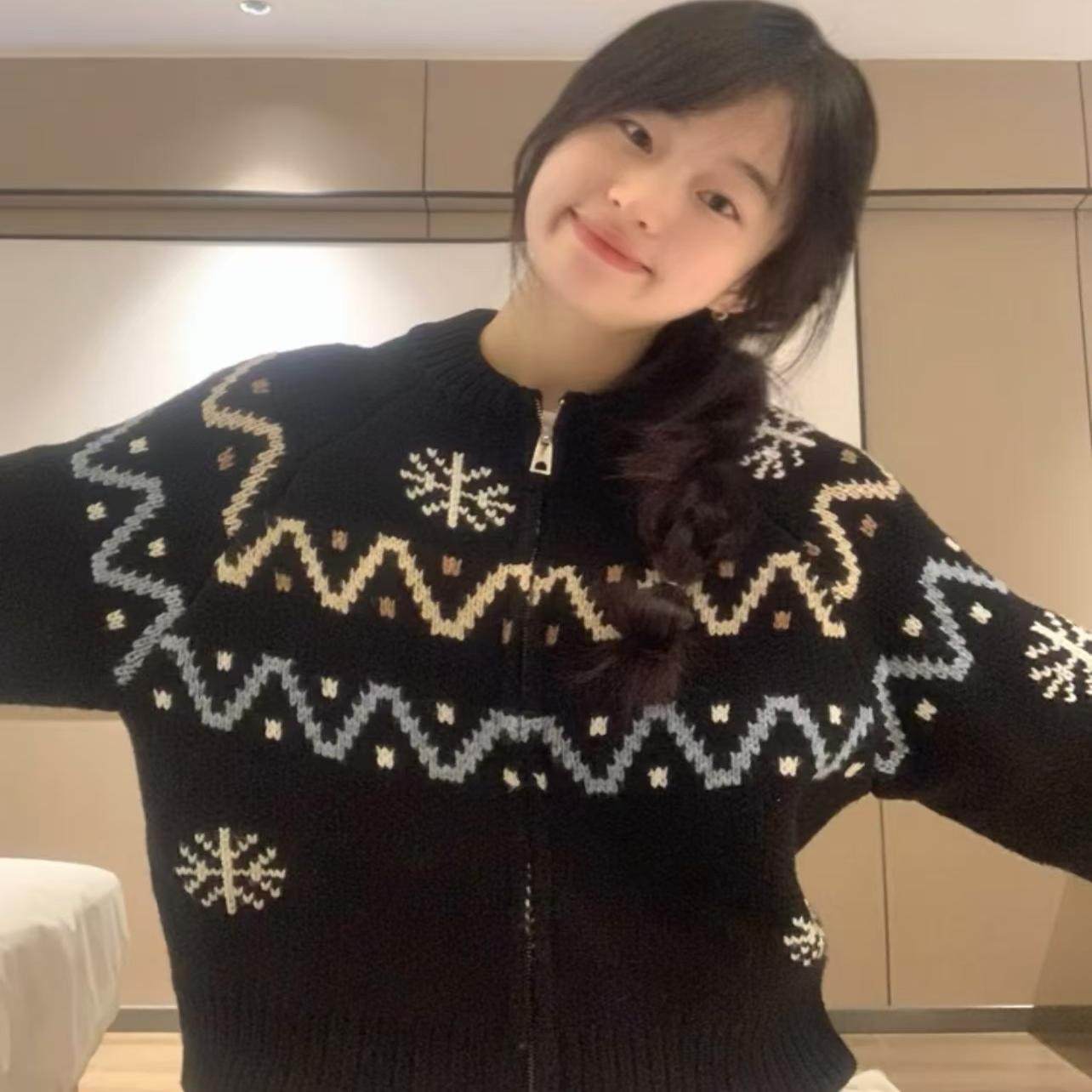 黑色提花拉链毛衣开衫 宽松雪花针织衫 女秋季 韩版 外套 新款 加厚版