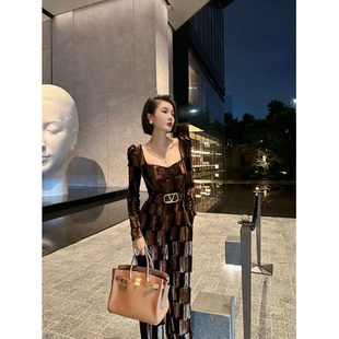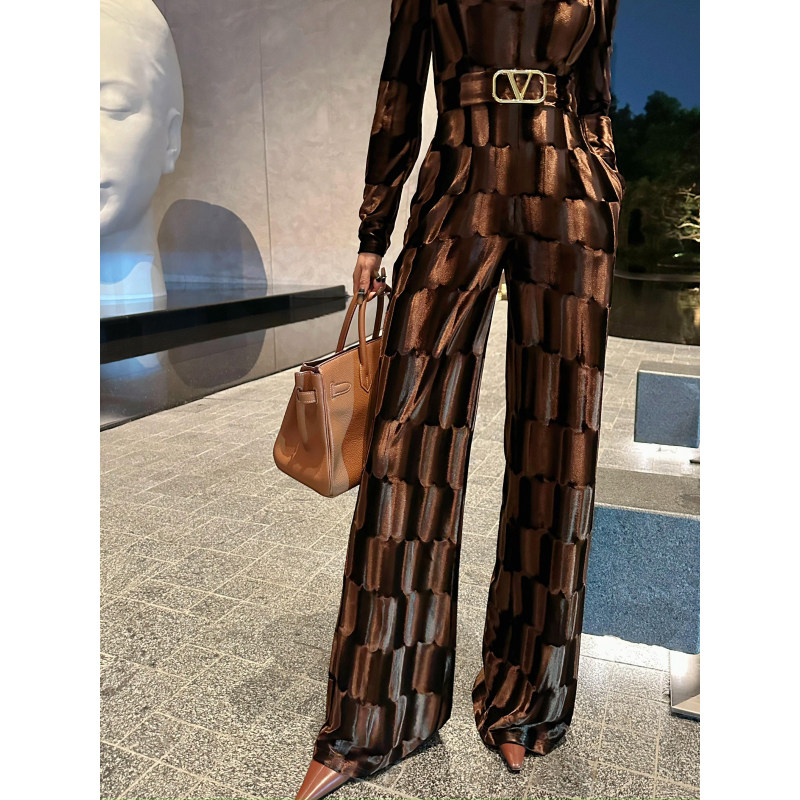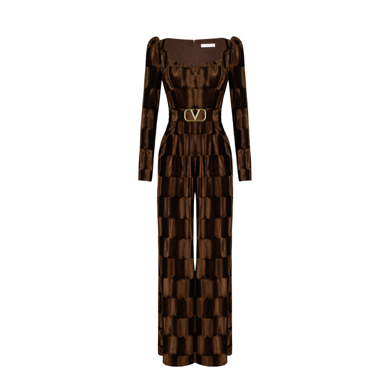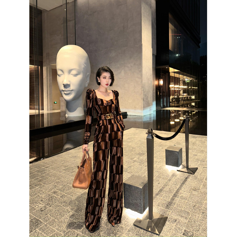 连体裤 显瘦桃心领长袖 时尚 XULU原创丝绒肌理格纹优雅女人味修身