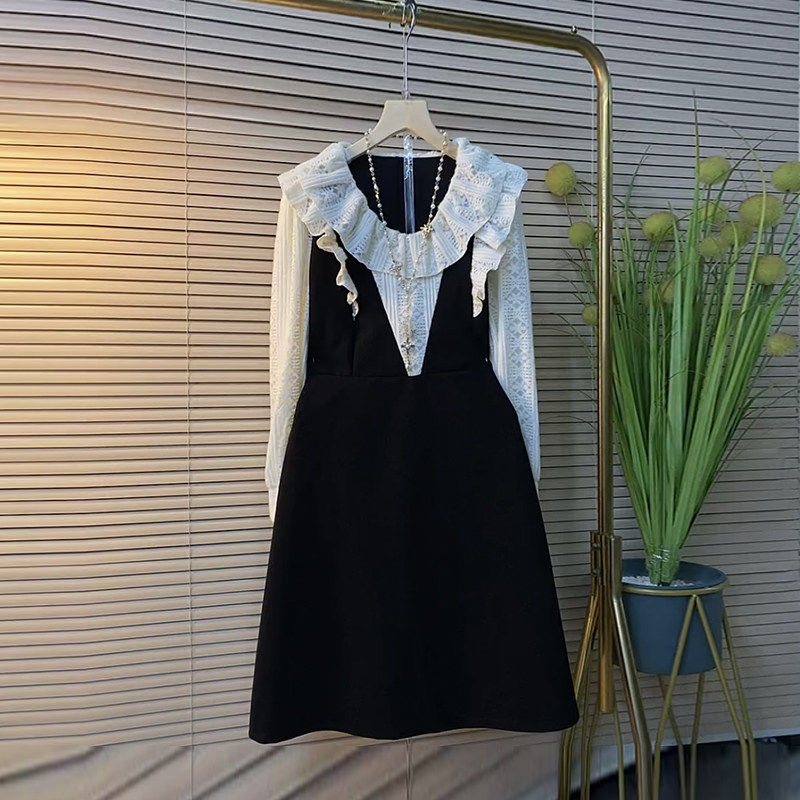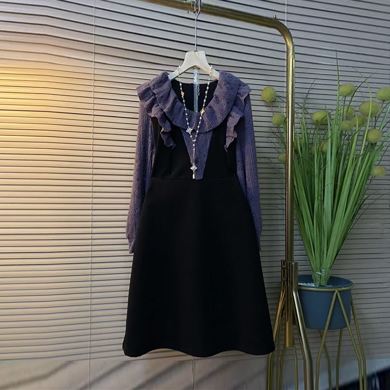 中长款 胖妹妹荷叶肩植绒长袖 韩版 女装 淑女裙 拼色假两件连衣裙大码