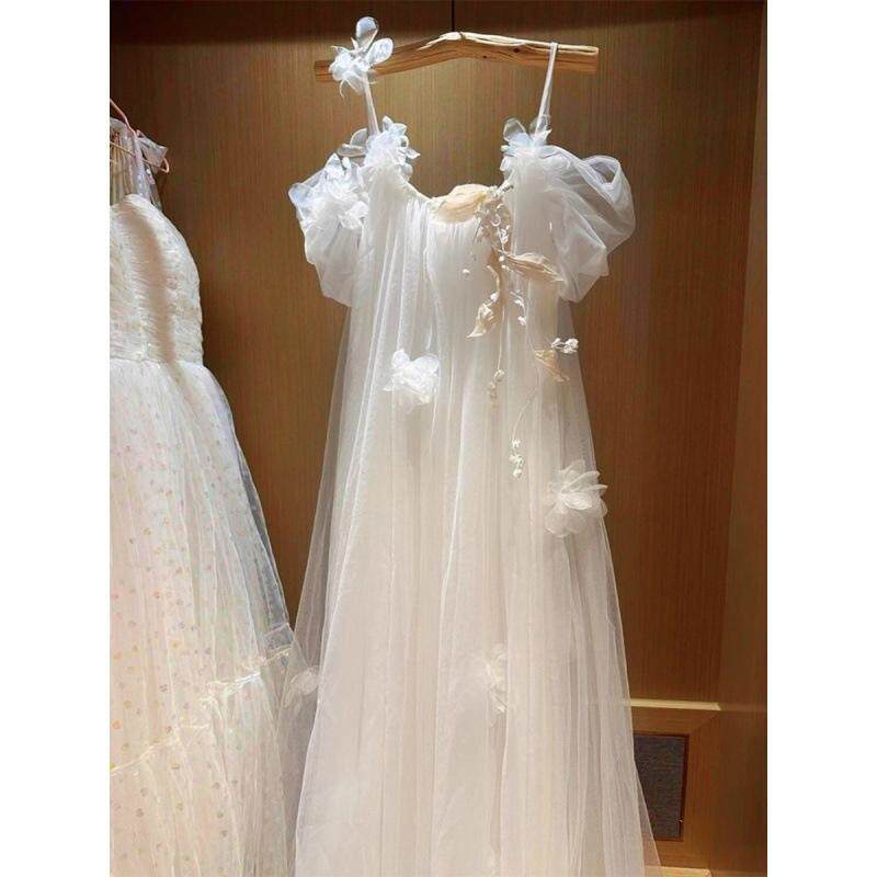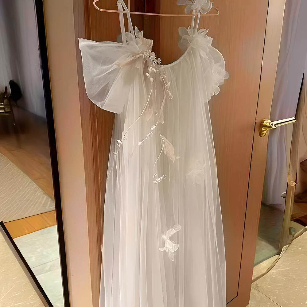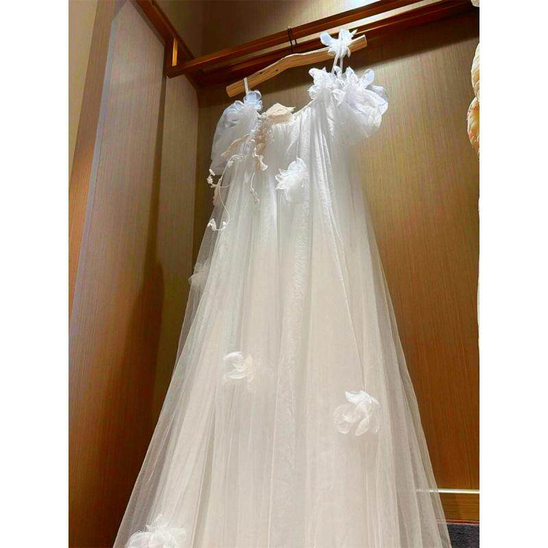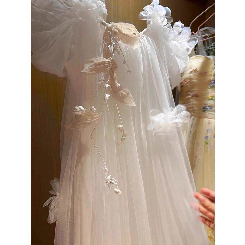 新娘结婚晨袍高级小众铃兰花超仙法式 吊带旅拍轻婚纱小拖尾出门纱