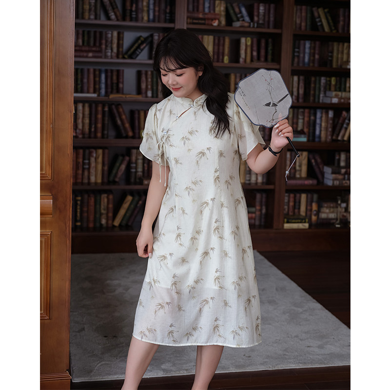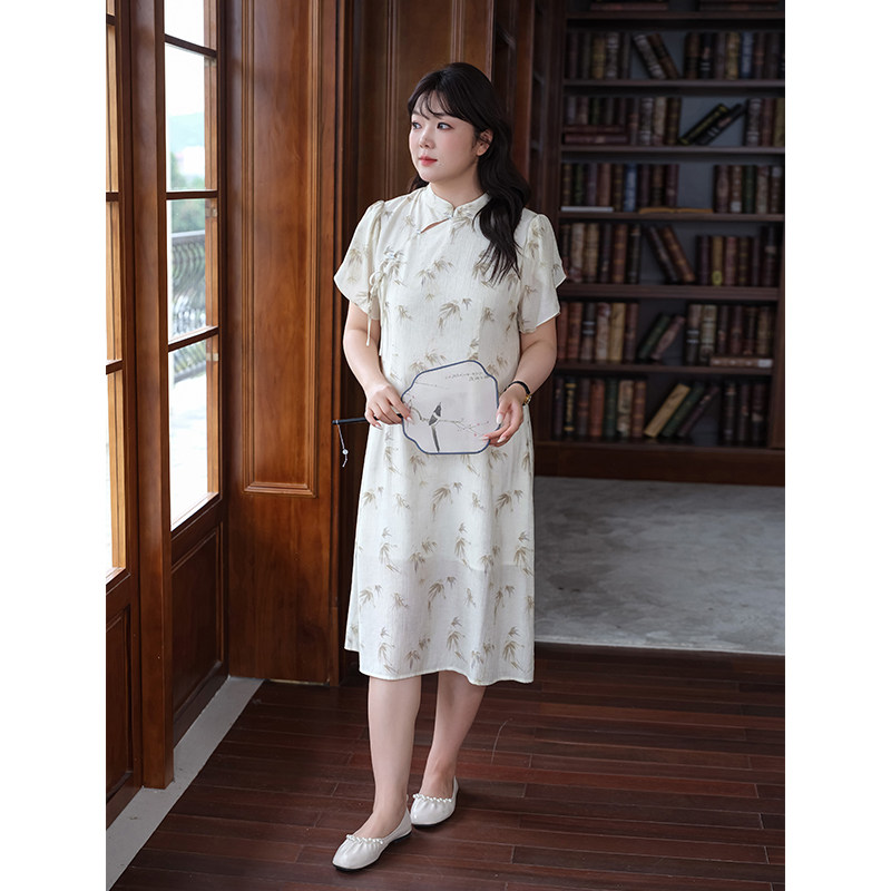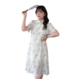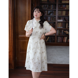 国风改良旗袍裙胖MM夏装 新中式 高级质感印花连衣裙 女装 蓝若水大码