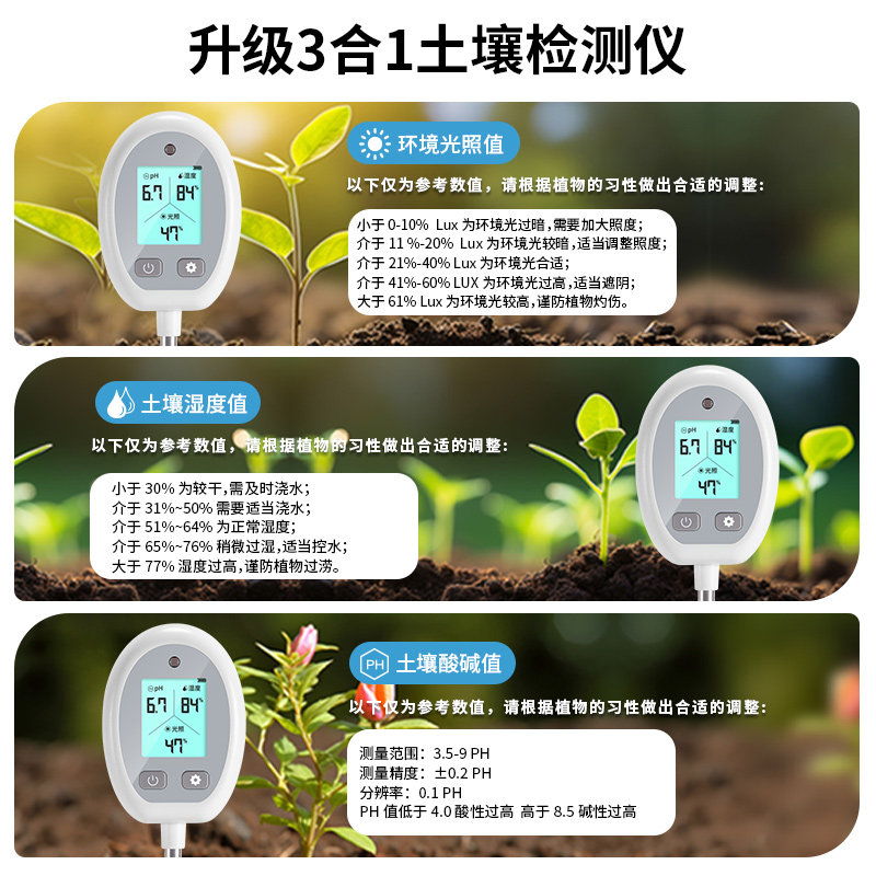 土壤湿度检测仪家用植物花卉多功能ph酸碱度温度计花盆土壤传感器
