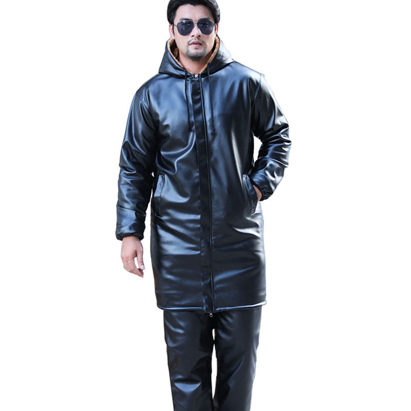 皮棉衣棉裤 宽松工作服套装 男式 加绒加厚皮衣防风保暖骑手冬天皮裤