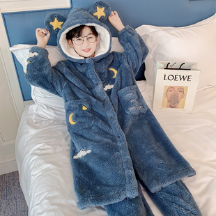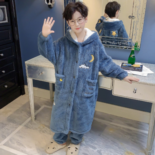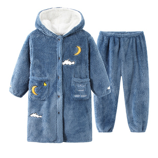 法兰绒藏青云朵居服套装 儿童珊瑚绒睡衣秋冬季 小孩男童睡袍加厚款