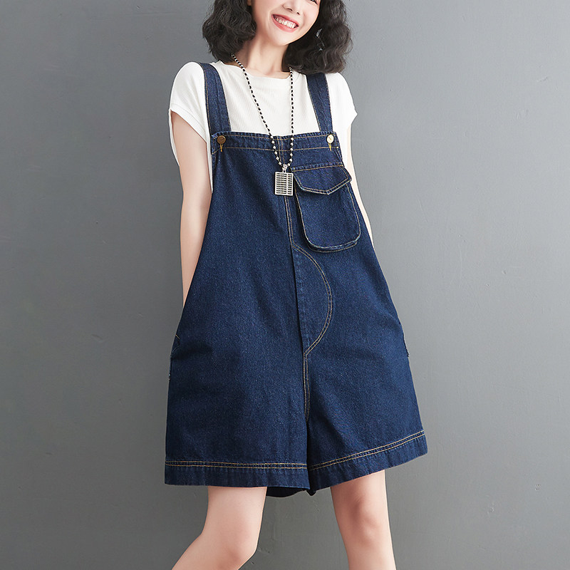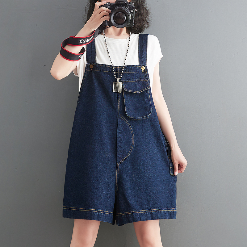 牛仔背带短裤 阔腿裤 女夏2024新款 小个子吊带连体裤 子 宽松韩版 大码