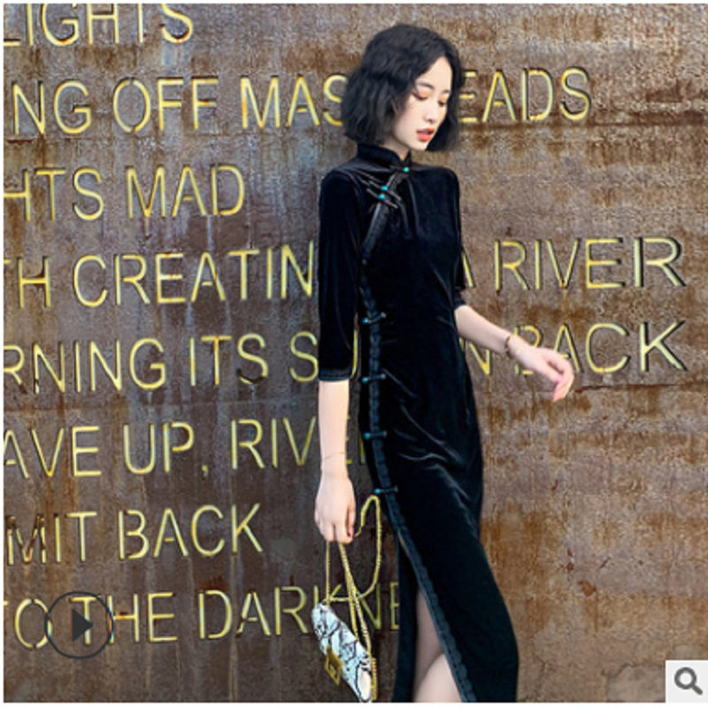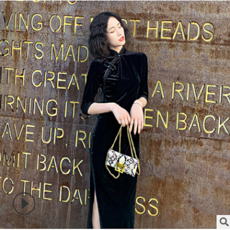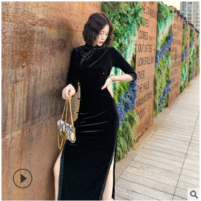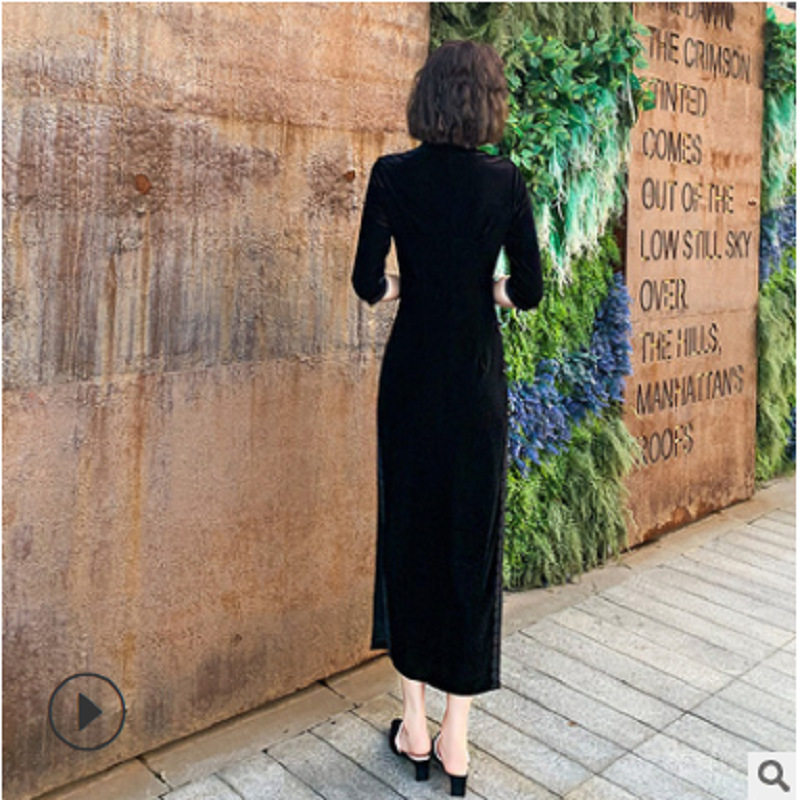 复古气质高贵时尚 立体花朵黑色丝绒长款 秋装 改良高端旗袍年轻款