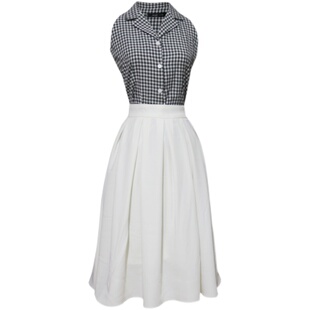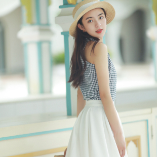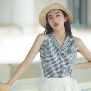 女夏季 JUJU定制港风复古露肩上衣西装 气质小衫 衬衫 领黑白格子无袖