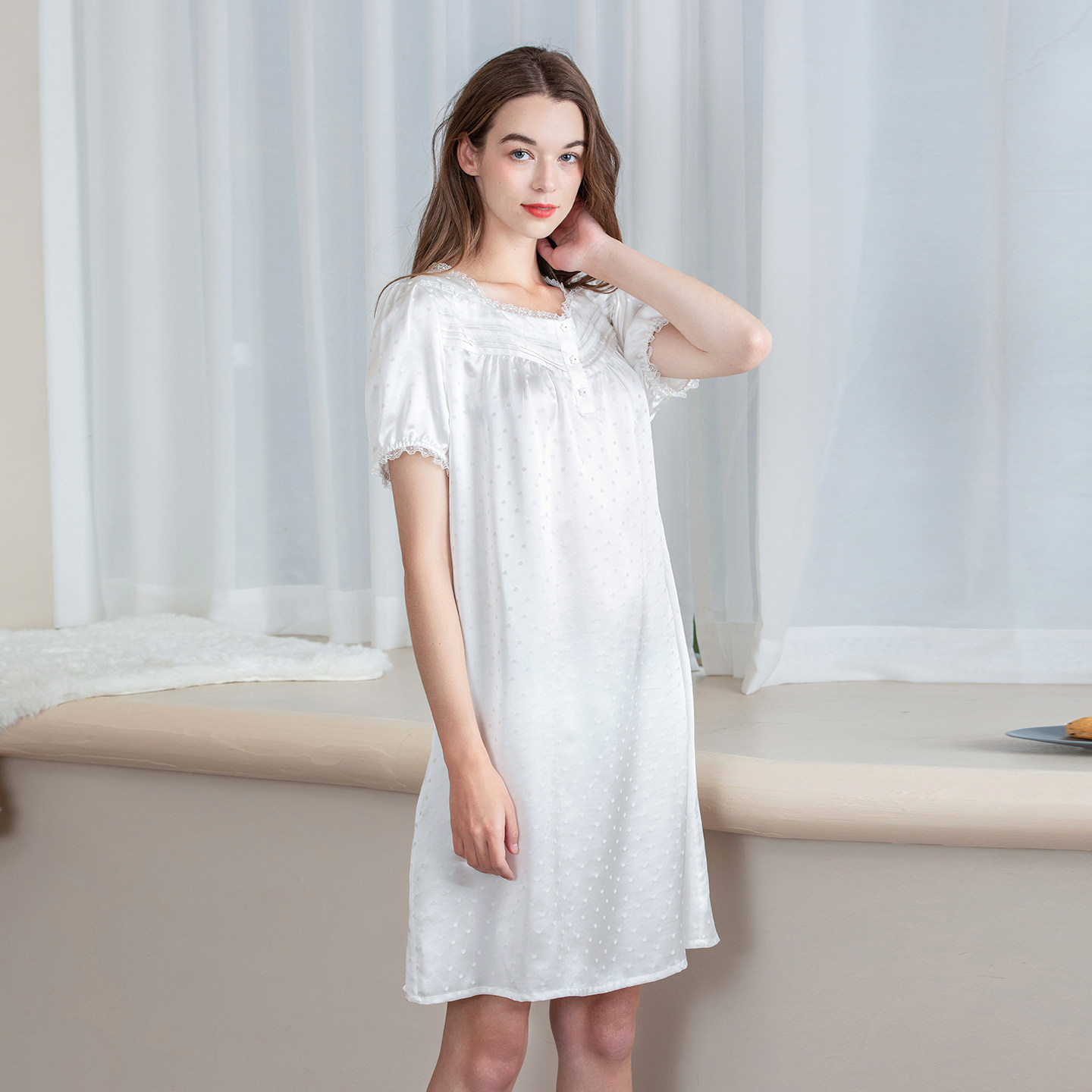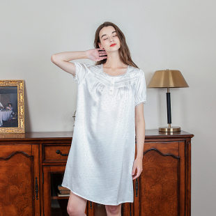 美标短袖 丝绸送礼家居服 睡衣100%桑蚕丝真丝白色睡裙女士夏季