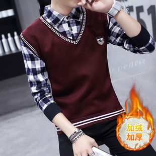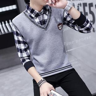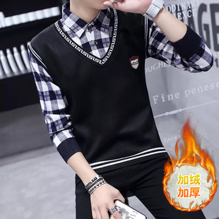 外套上衣服男装 秋冬季 毛衣男假两件加绒加厚保暖衬衣潮流线衣衬衫