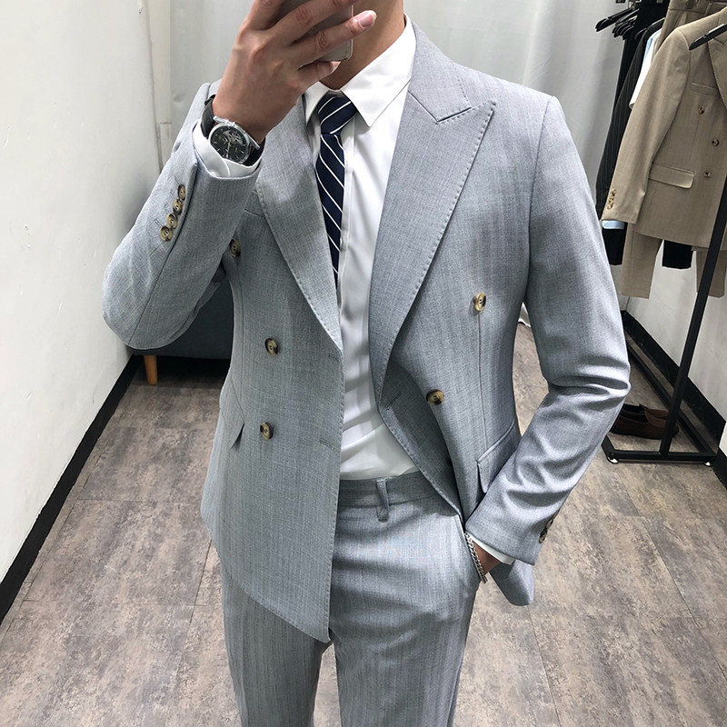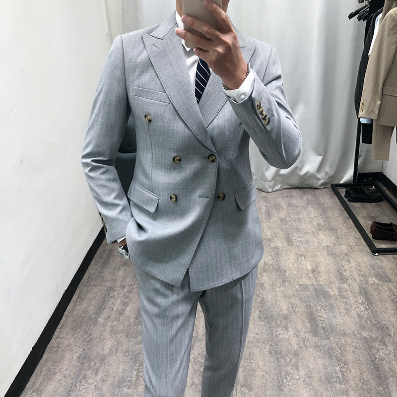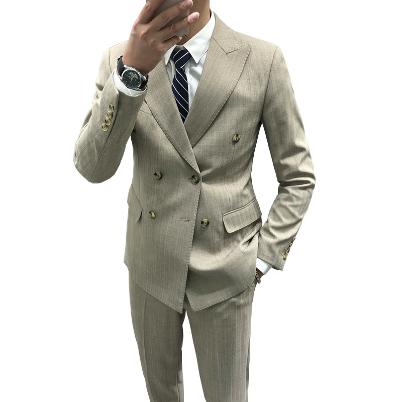 男套装 韩版 修身 2023春季 条纹西服套装 双排扣西装 商务休闲时尚 新款