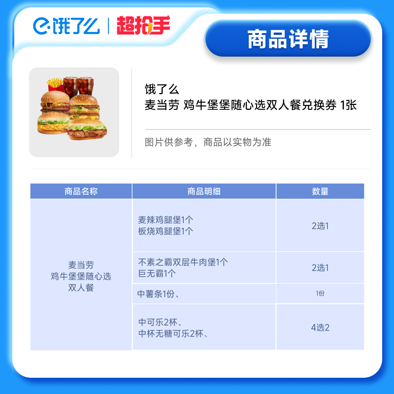 饿了么外卖麦当劳鸡牛堡堡随心选双人餐券全国通用券非代下单