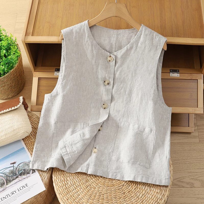 上衣西装 休闲复古棉麻宽松无袖 棉麻 薄款 坎肩马甲圆领背心2025夏季