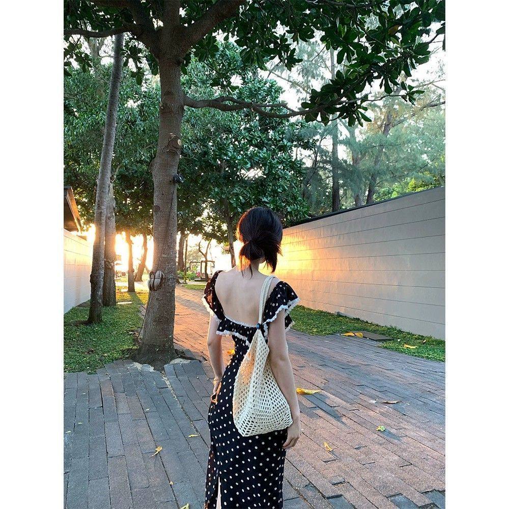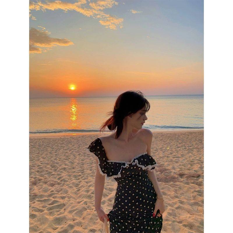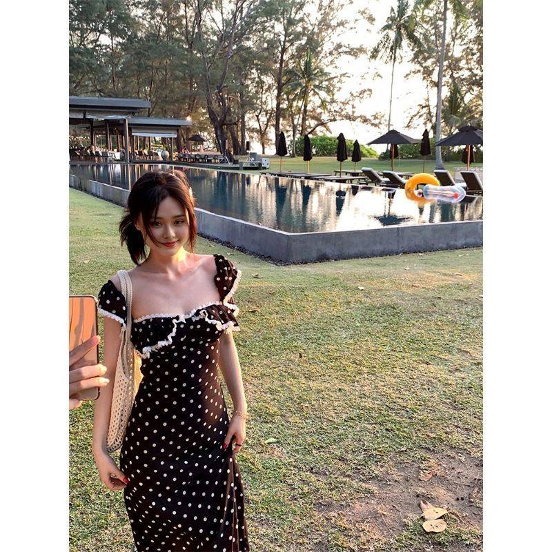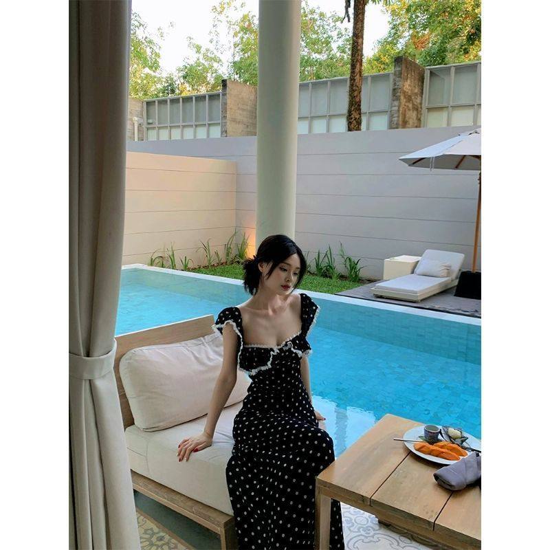 蕾丝小飞袖 收腰系带显瘦方领夏季 高级a字波点连衣裙 新款 2025法式