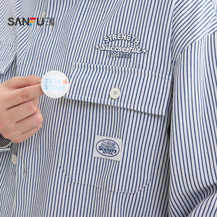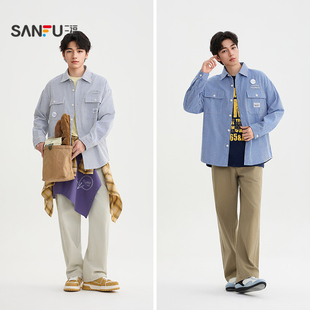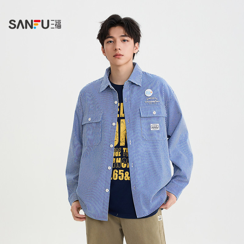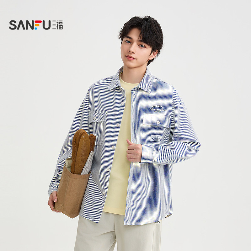 条纹休闲时尚 男长袖 翻领宽松衬衣506151 衬衫 三福2025秋冬新款