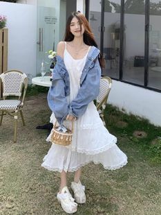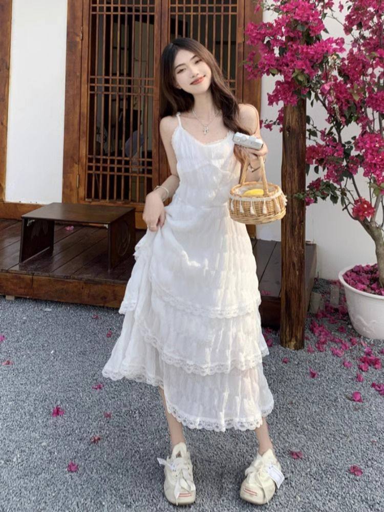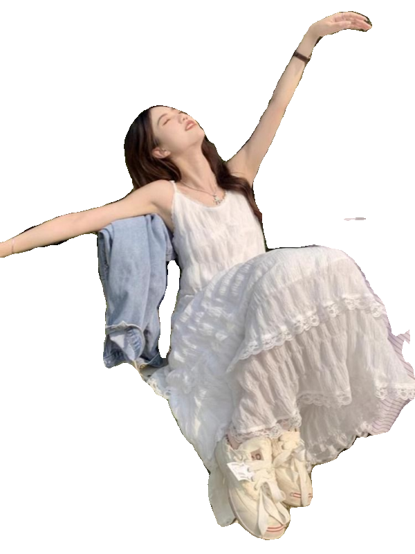 2024新款 白色蕾丝吊带连衣裙仙女夏超仙蛋糕内搭长裙子 法式