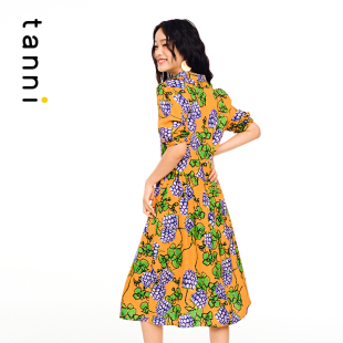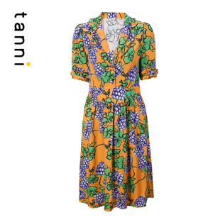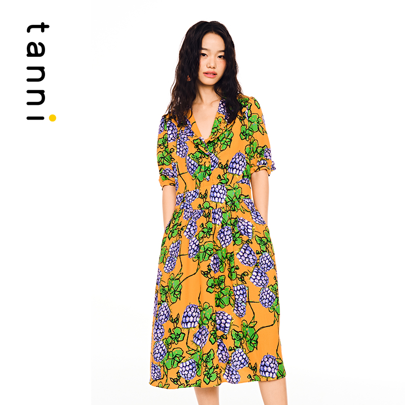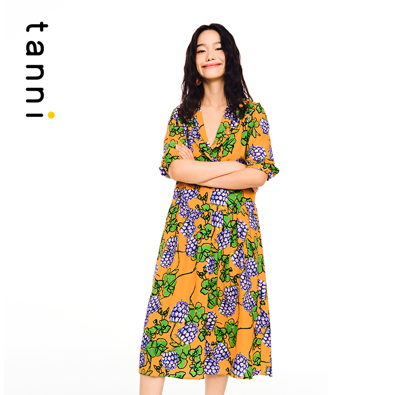 tanni通勤休闲日常花色小V领中长款 连衣裙印花百搭TL11DR027A