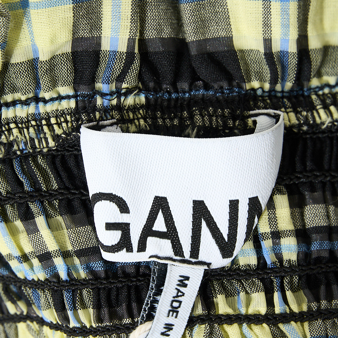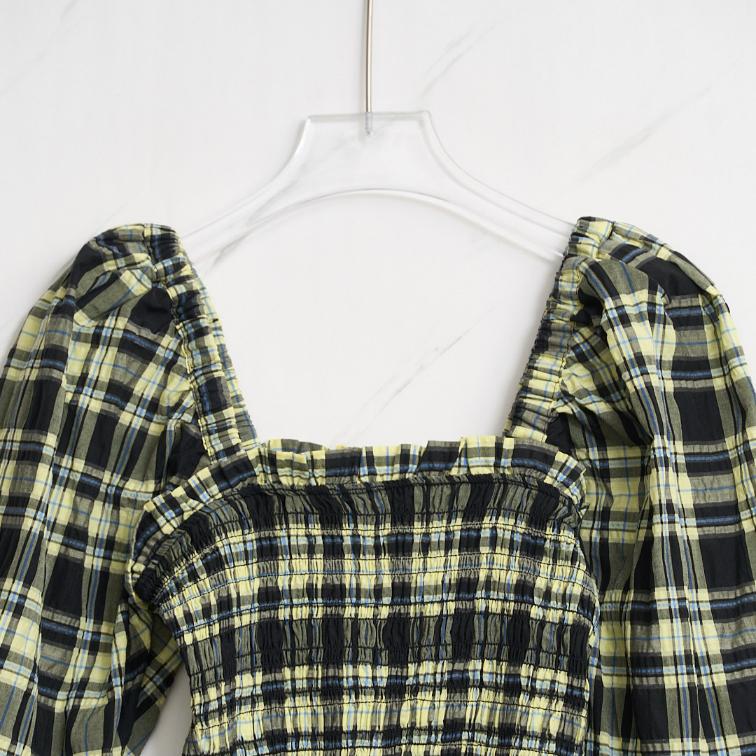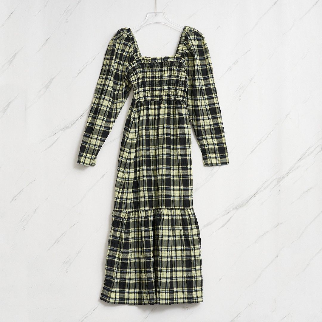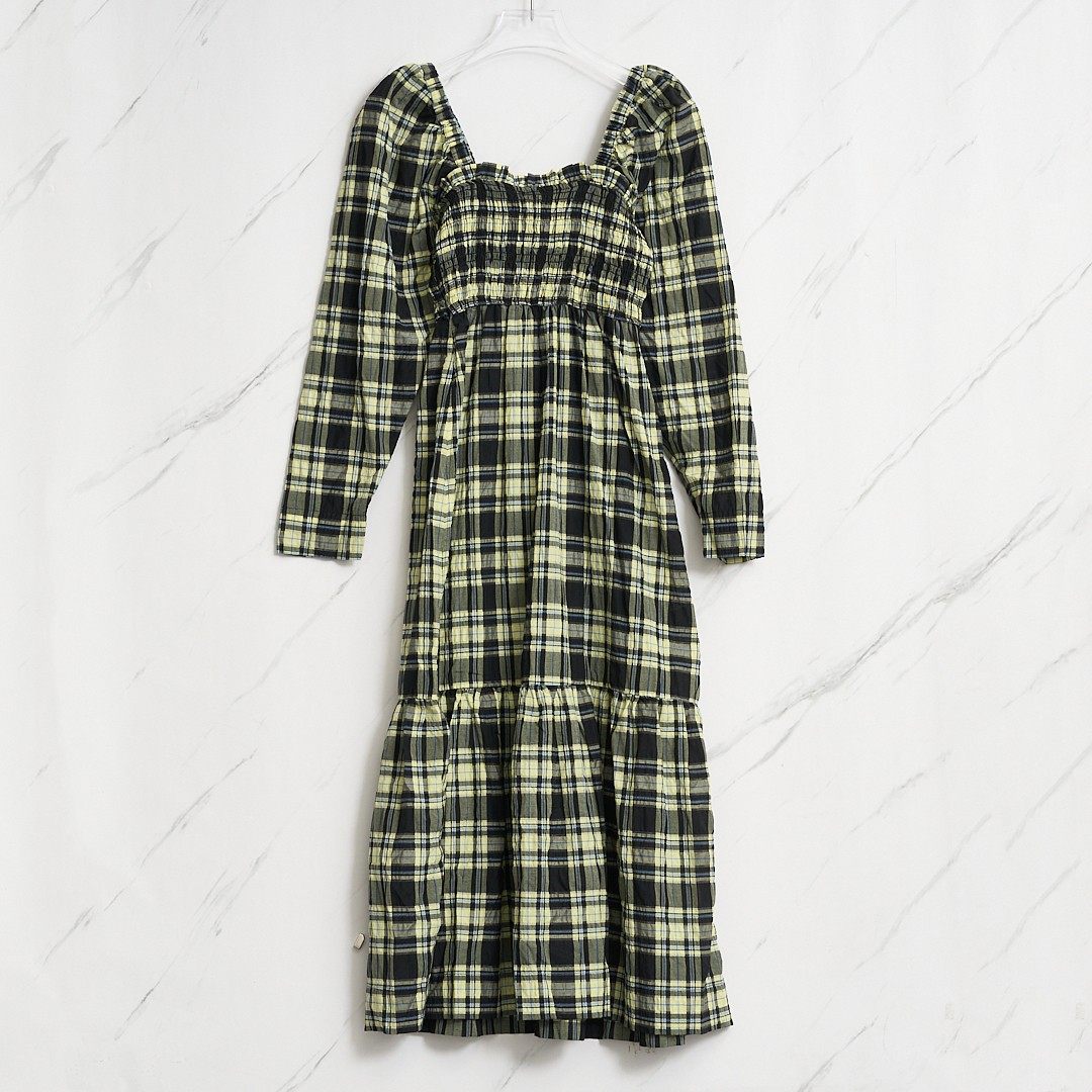 301596 长裙银泰百货精品 GANNI女士潮流格纹泡泡袖 连衣裙中长款