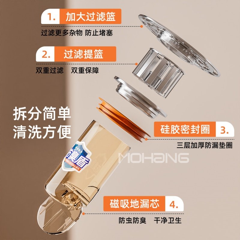潜水艇地漏防臭器卫生间下水道磁吸防臭内芯神器防虫不锈钢芯盖