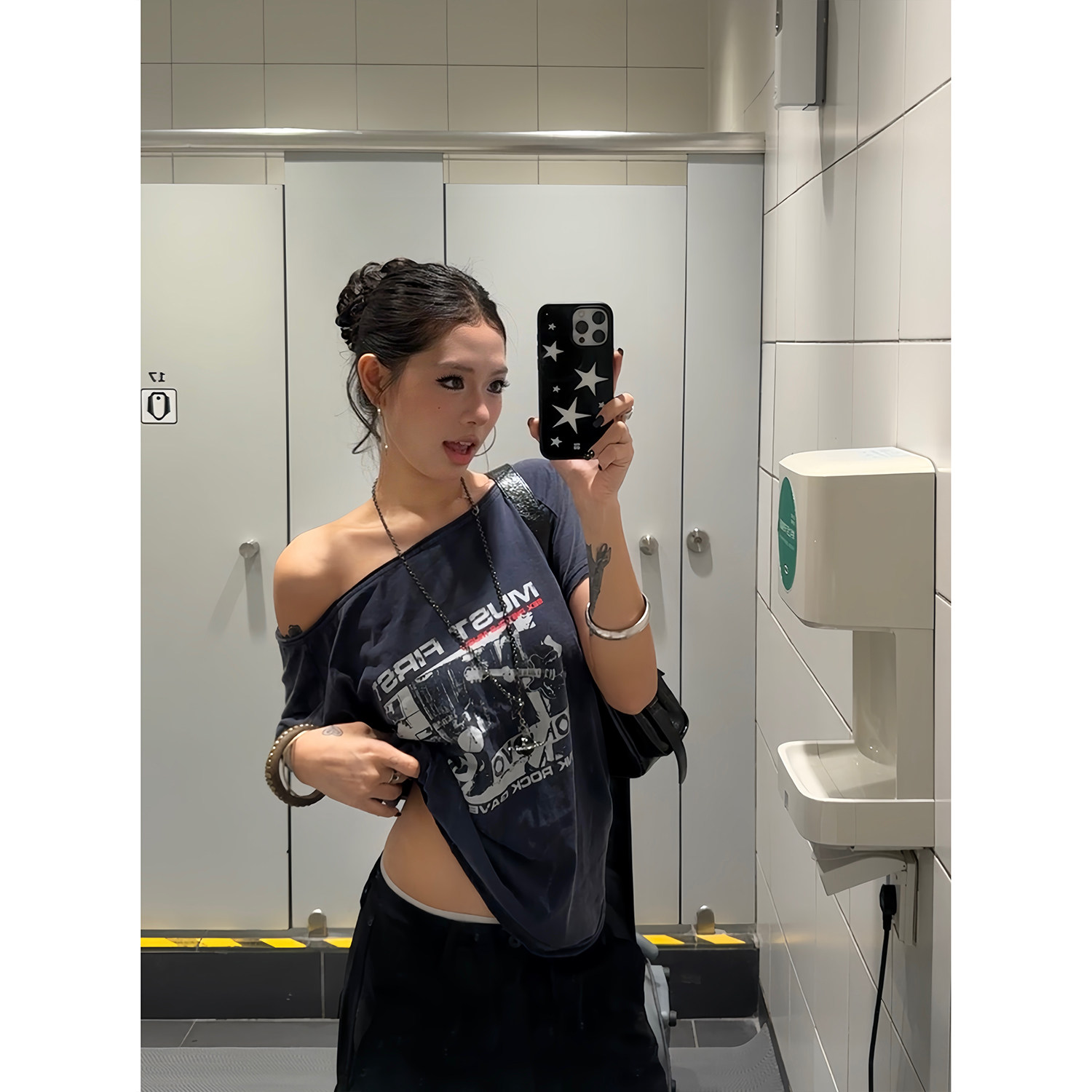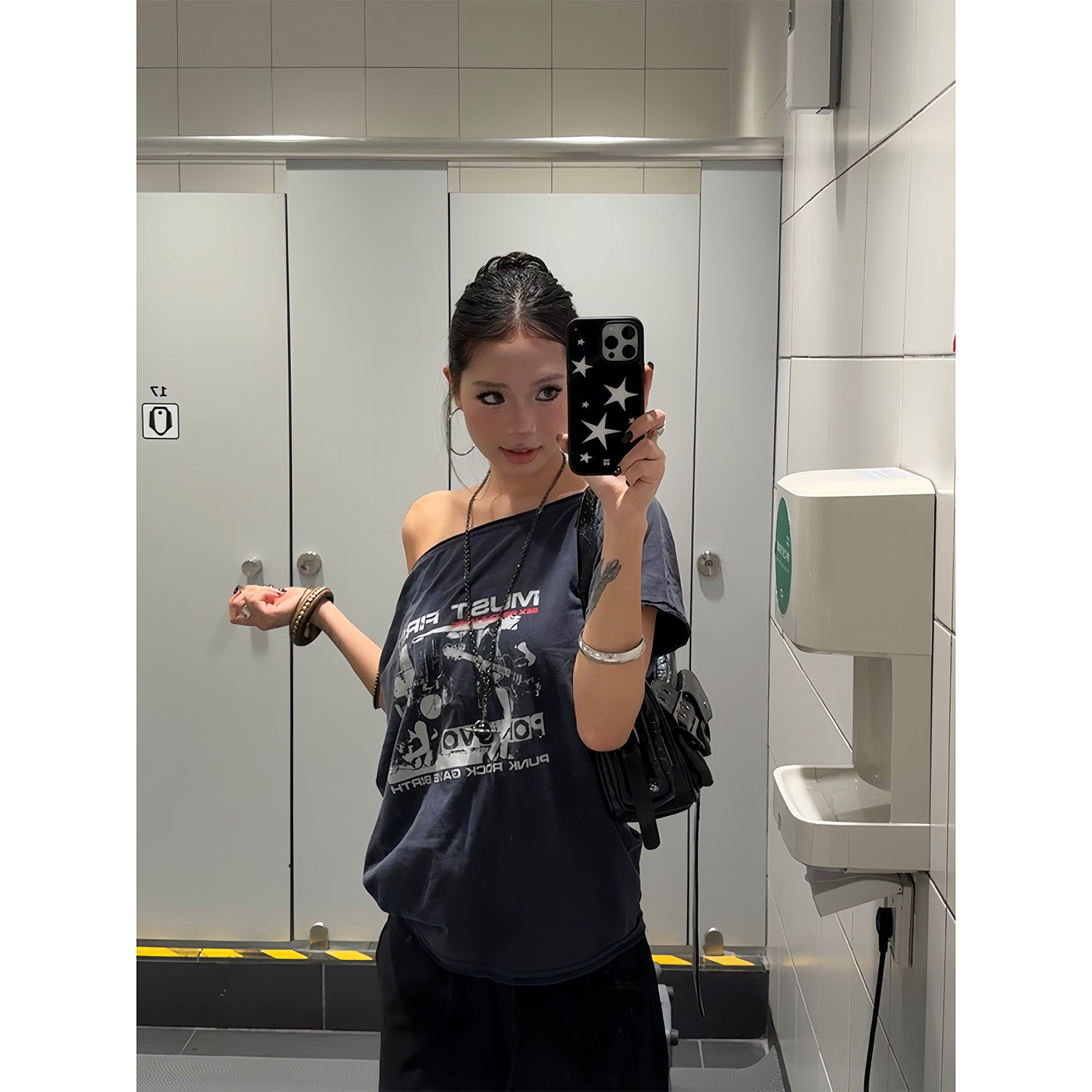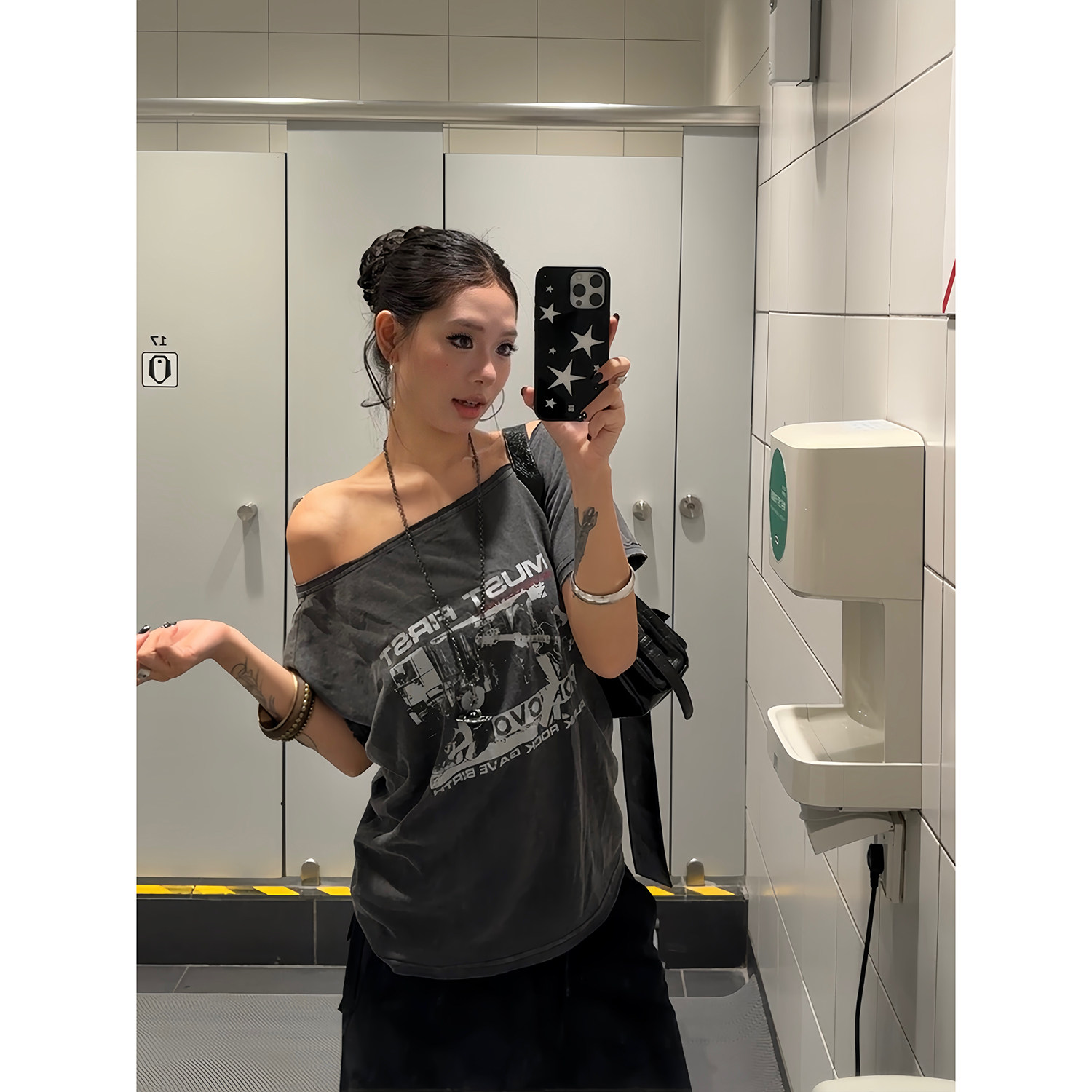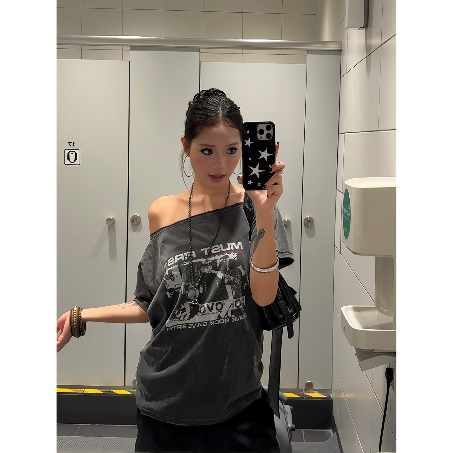 T恤辣妹显瘦百搭宽松上衣女夏季 复古水洗斜肩印花短袖 潮 美式 F383