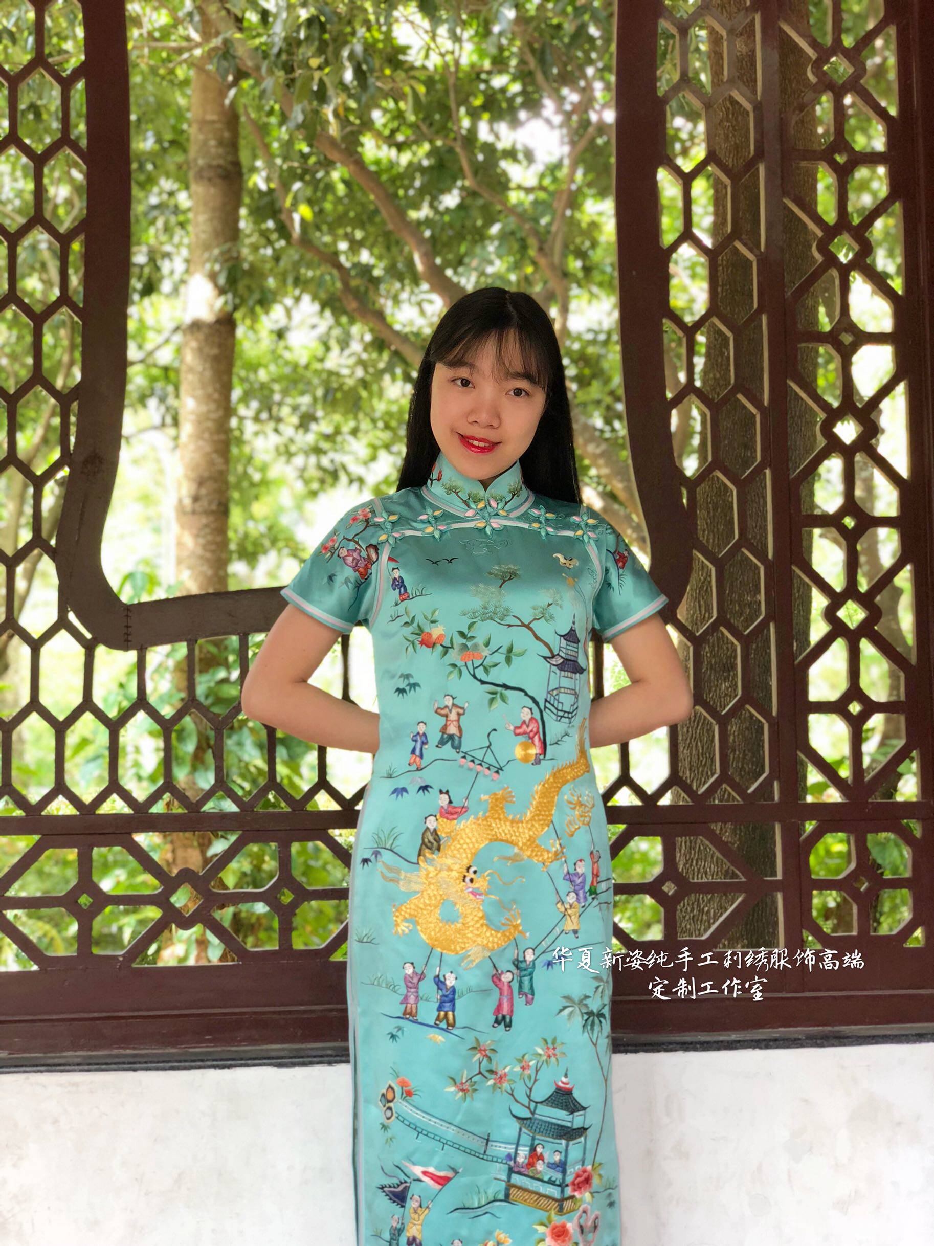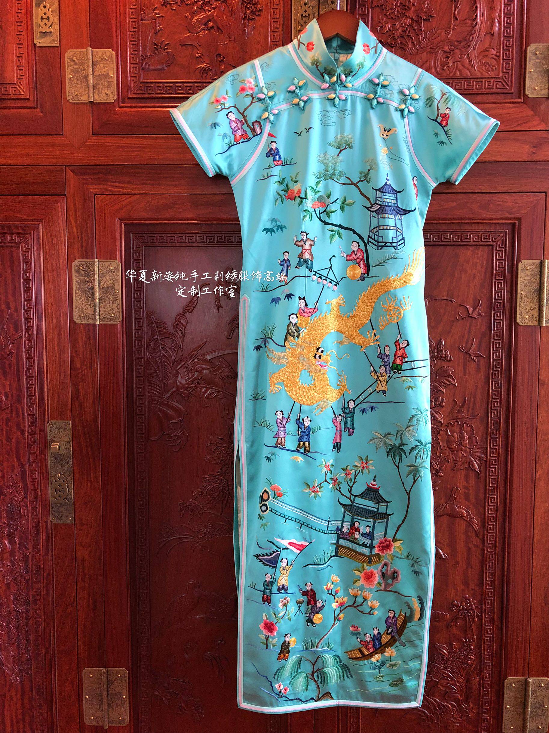 高端私人定制复古中国风镇店馆藏级纯手工苏绣百子闹春图旗袍礼服