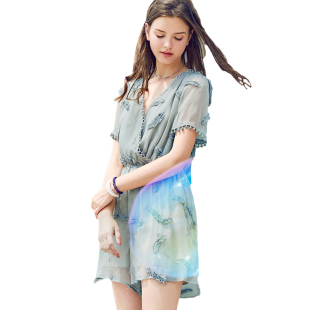 阔腿短裤 羽毛刺绣灰色雪纺连体裤 韩版 新款 高腰 女夏宽松2025秋季